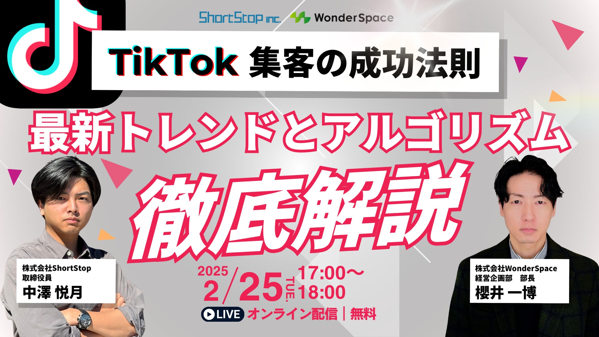 株式会社WonderSpace(本社:東京都港区、代表取締役社長:山本 尚宏)は、株式会社ShortStop(本社:神奈川県茅ヶ崎市 代表取締役:星野颯希)と『TikTok集客の成功法則!最新トレンドとアルゴリズムを徹底解説』をテーマにした共催ウェビナーを開催します。