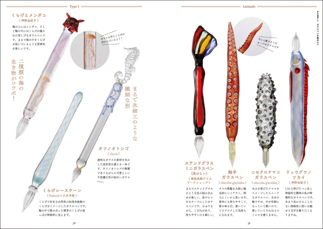 〈ガラスペン タイプ別紹介〉Type1 動物(Animals)/Type2 食べ物&飲み物(Foods & Drinks)/Type3 自然(Nature)/Type4 月&星(Moon & Star)/Type5 ファンタジー(Fantasy)/Type6 形がユニーク(Unique shape)/Type7 軸の色を楽しむ(Shaft Series)/ガラスぺンの保管方法