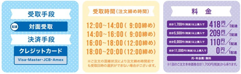 受け取り時間を指定できるため、仕事や育児、介護や天候の悪い日など、店舗に立ち寄ることや時間がないときにも簡単で便利なサービスです。月会費・年会費も無いため、サービス登録いただくことでいつでも気軽に利用できます。