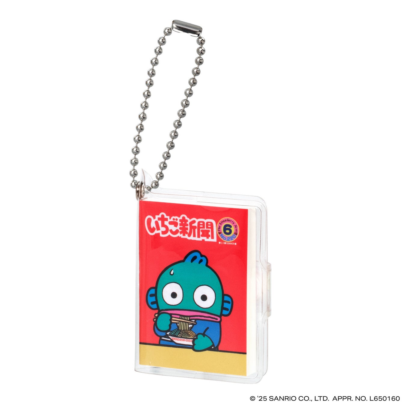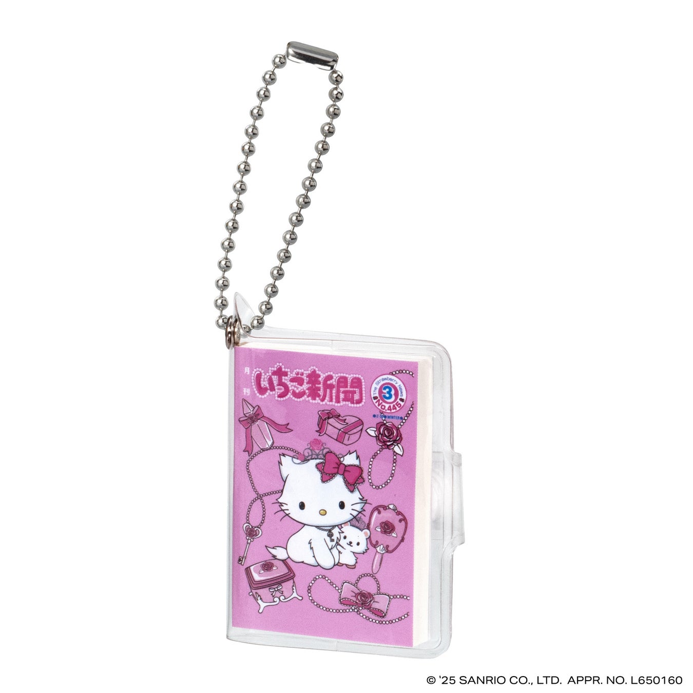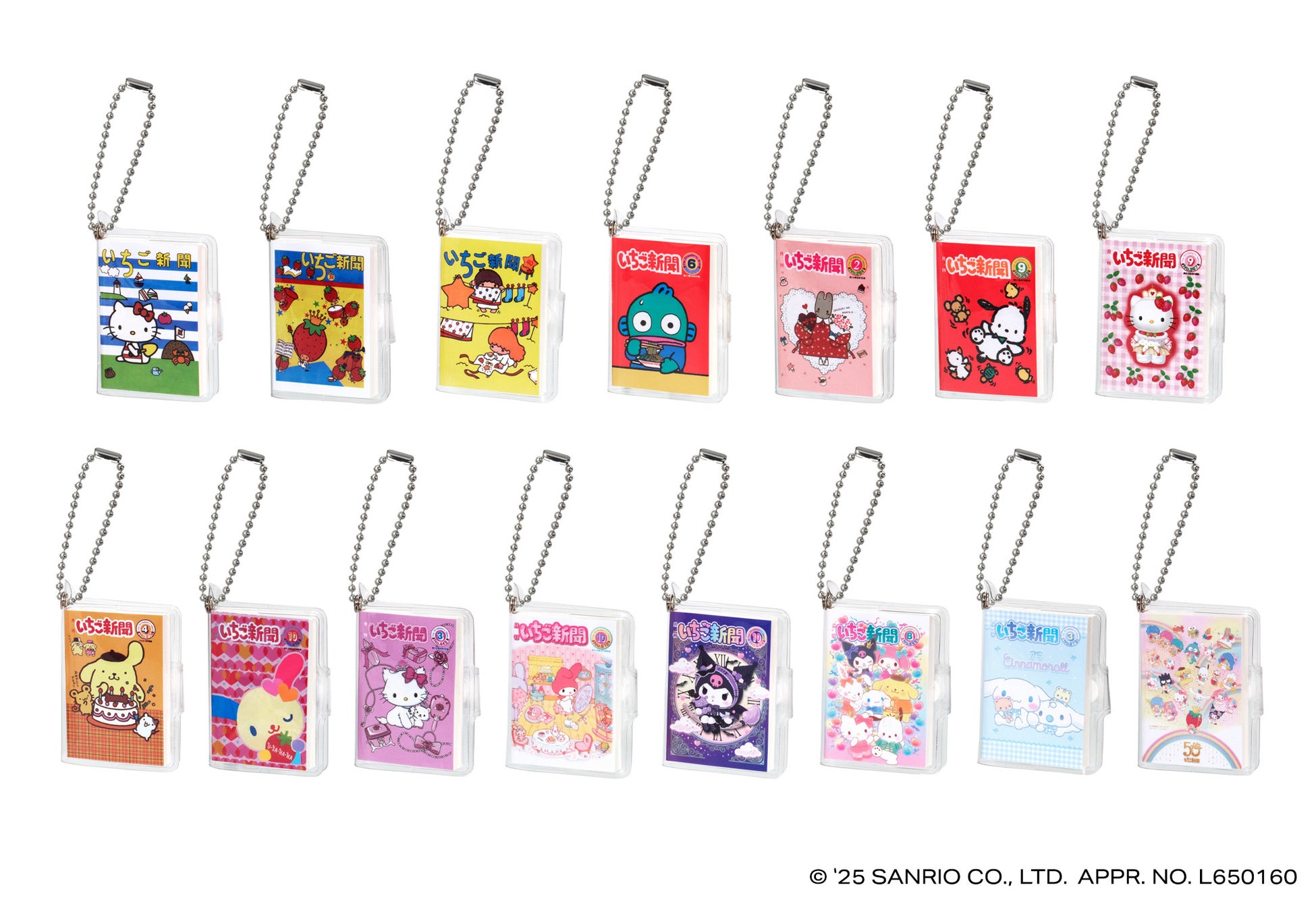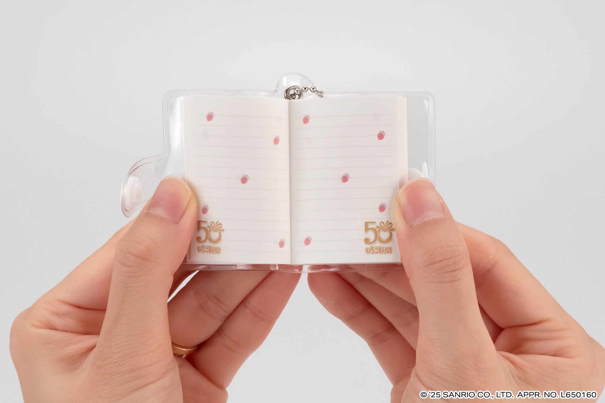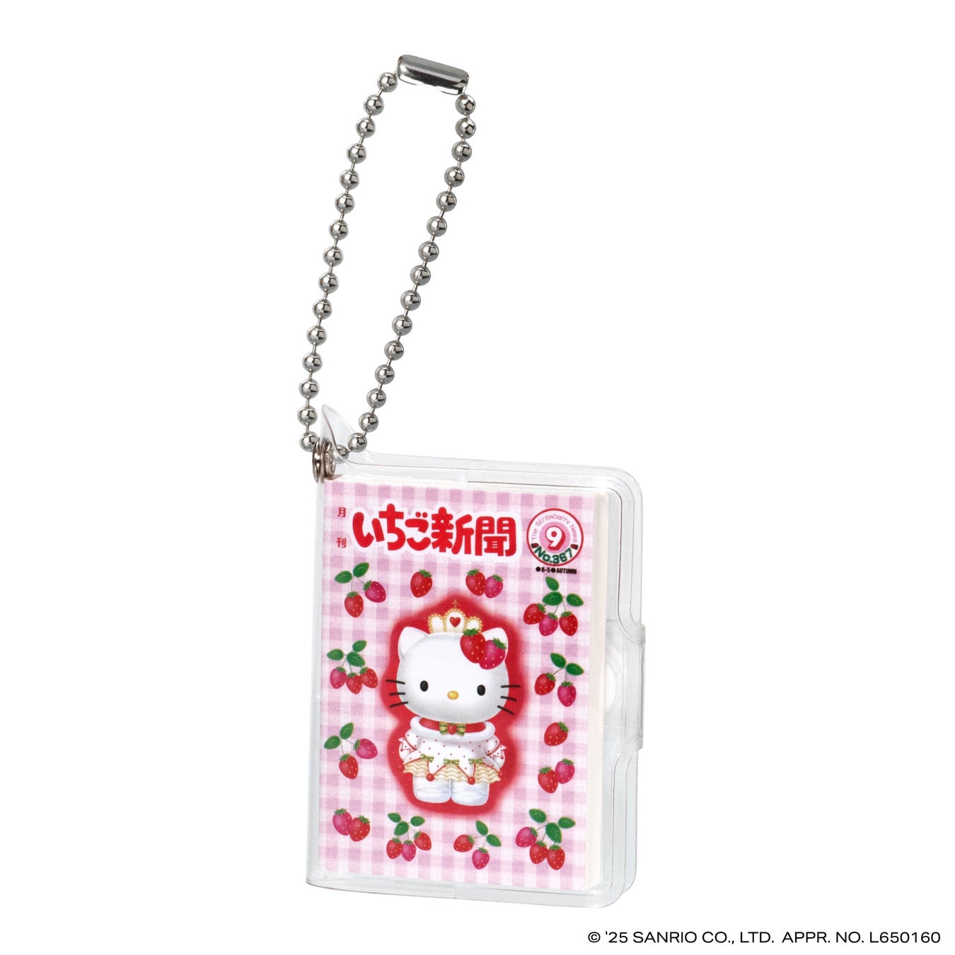 本商品は、今年創刊50周年の機関紙「月刊 いちご新聞」の歴代の表紙をデザインした全高約58mmの豆ノートです。レトロなデザインのハローキティが表紙の「NO.32」、いちごの王さまメインデザインの「NO.34」など、様々な世代に思い入れのある表紙デザインをラインアップし、50年の歴史を感じられます。中のノートはいちご柄のデザインで、実際に書くこともできます。透明カバーとボールチェーン付きなのでチャームとして身につけてもかわいいアイテムです。