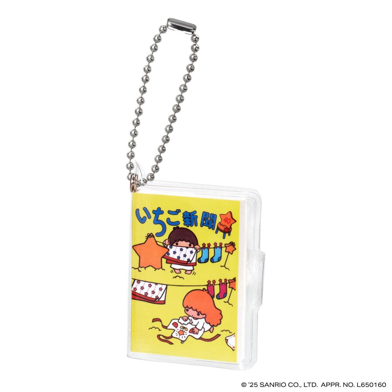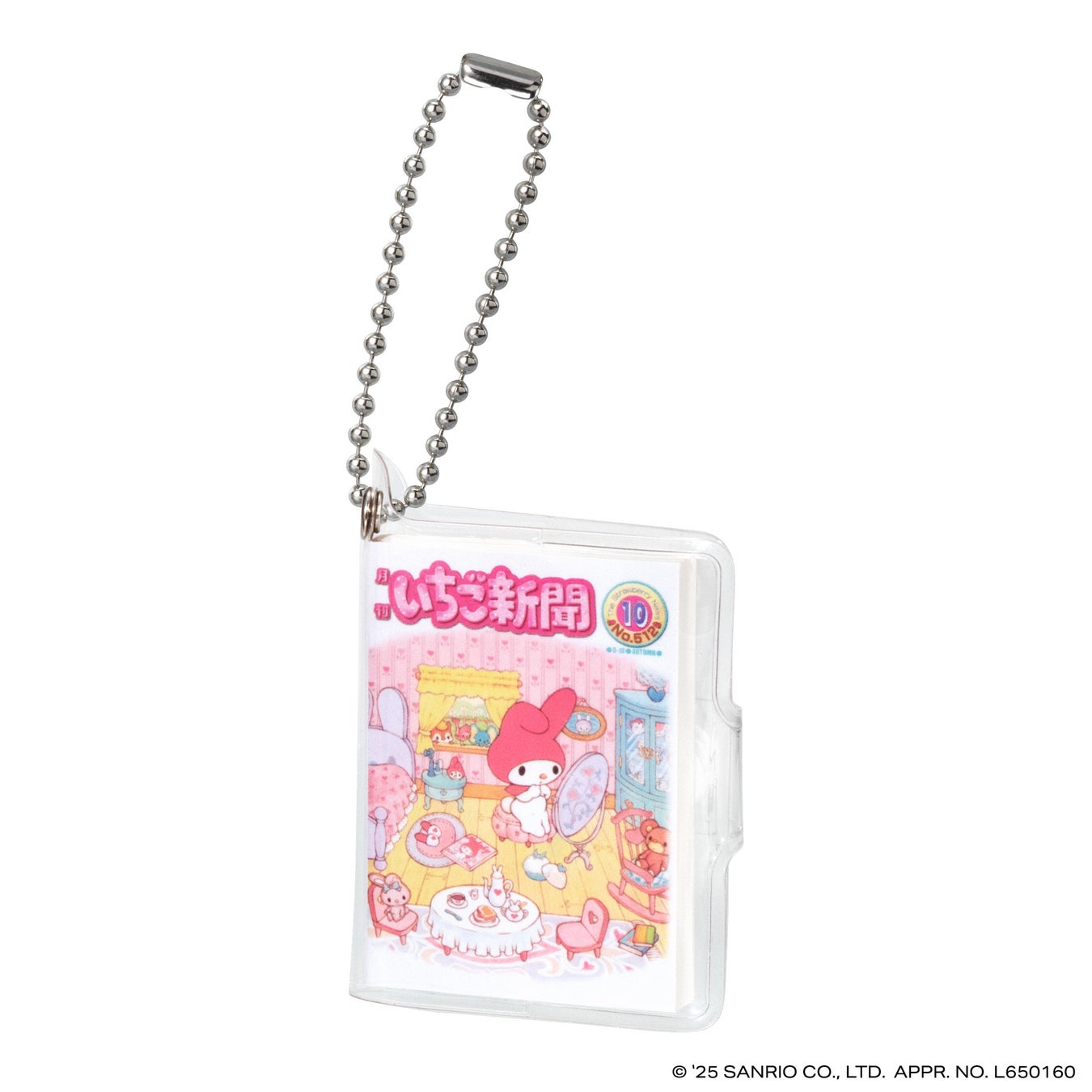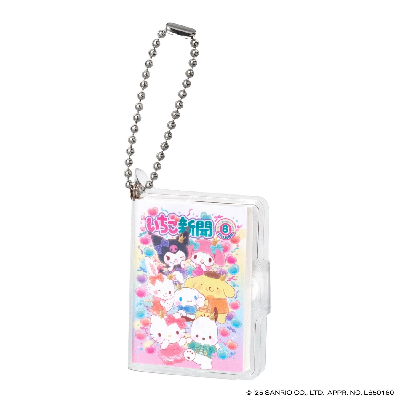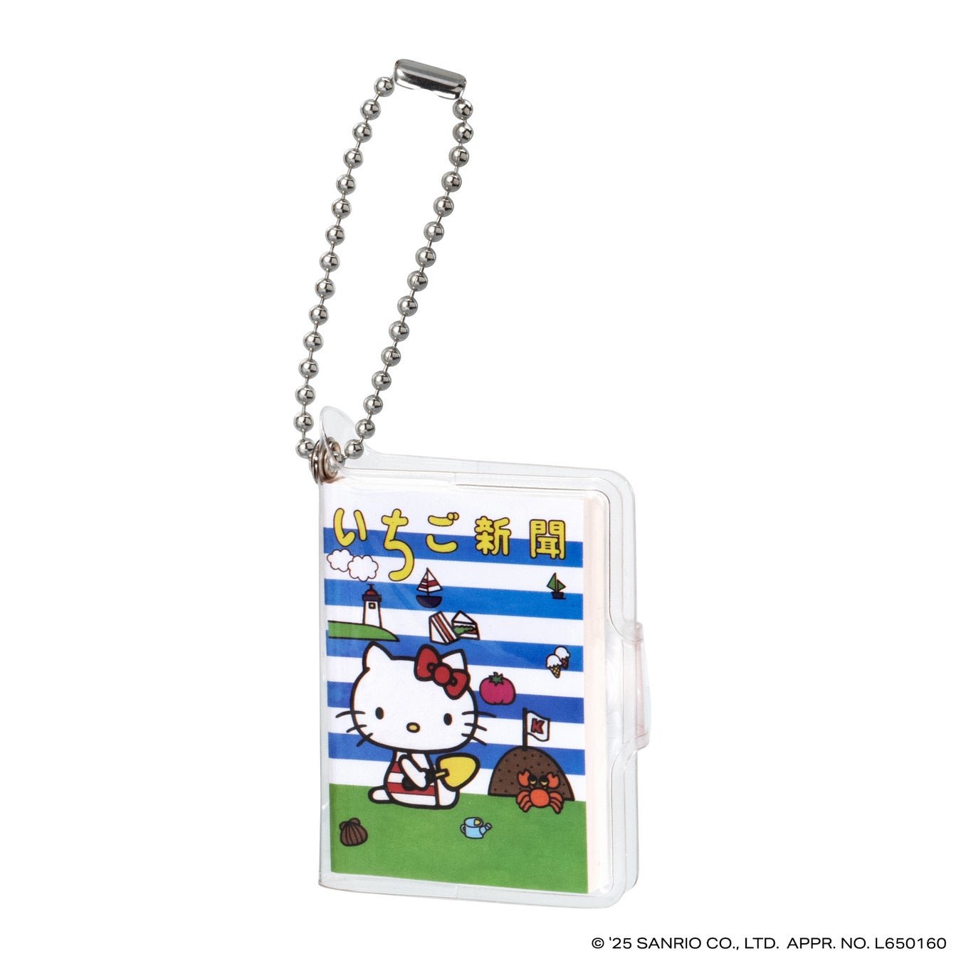 本商品は、今年創刊50周年の機関紙「月刊 いちご新聞」の歴代の表紙をデザインした全高約58mmの豆ノートです。レトロなデザインのハローキティが表紙の「NO.32」、いちごの王さまメインデザインの「NO.34」など、様々な世代に思い入れのある表紙デザインをラインアップし、50年の歴史を感じられます。中のノートはいちご柄のデザインで、実際に書くこともできます。透明カバーとボールチェーン付きなのでチャームとして身につけてもかわいいアイテムです。
