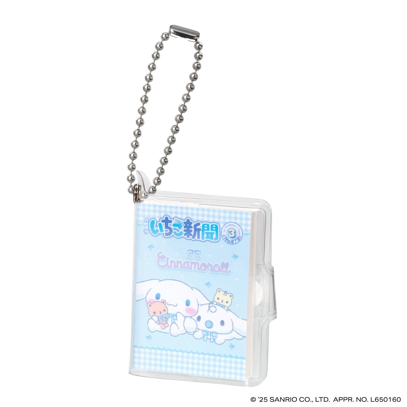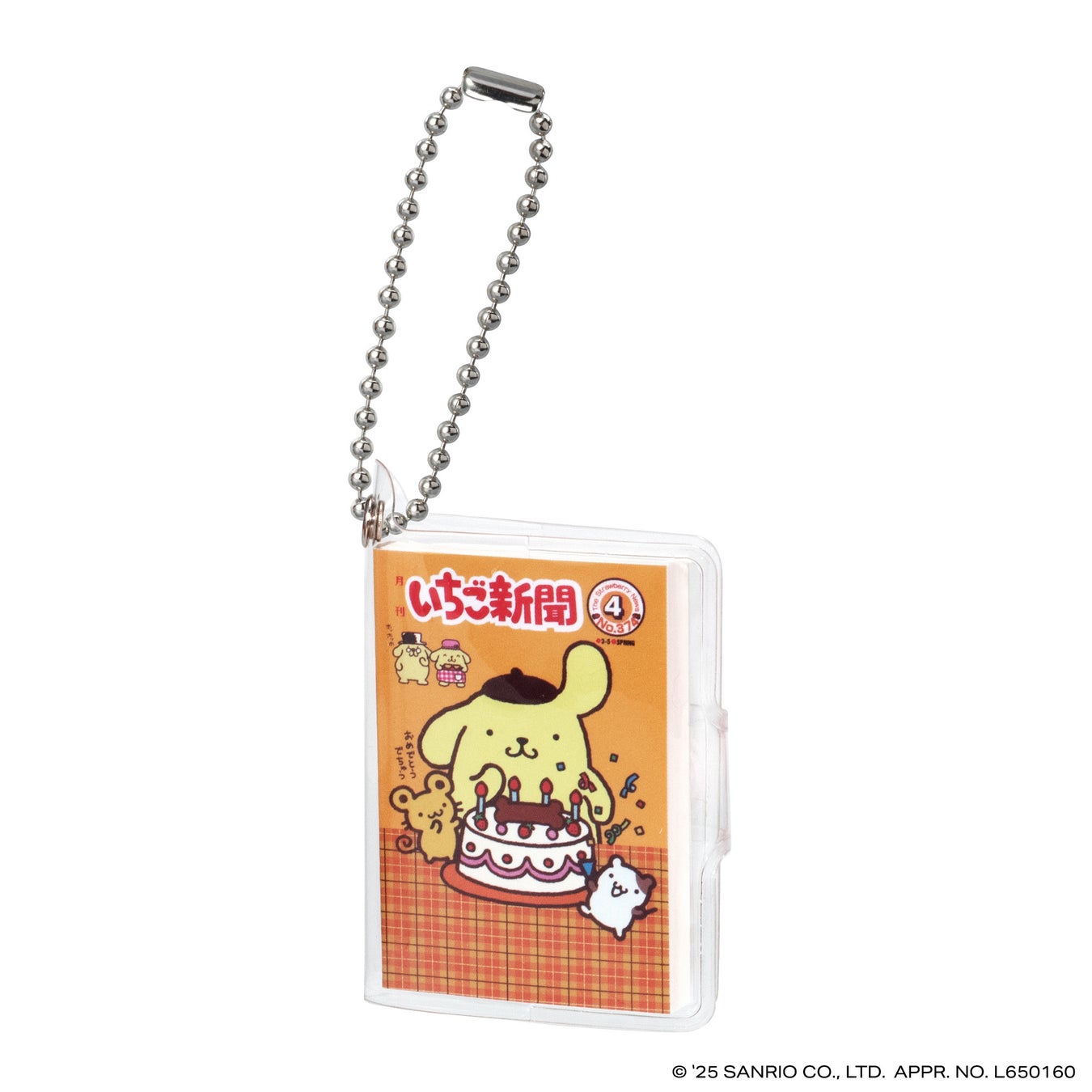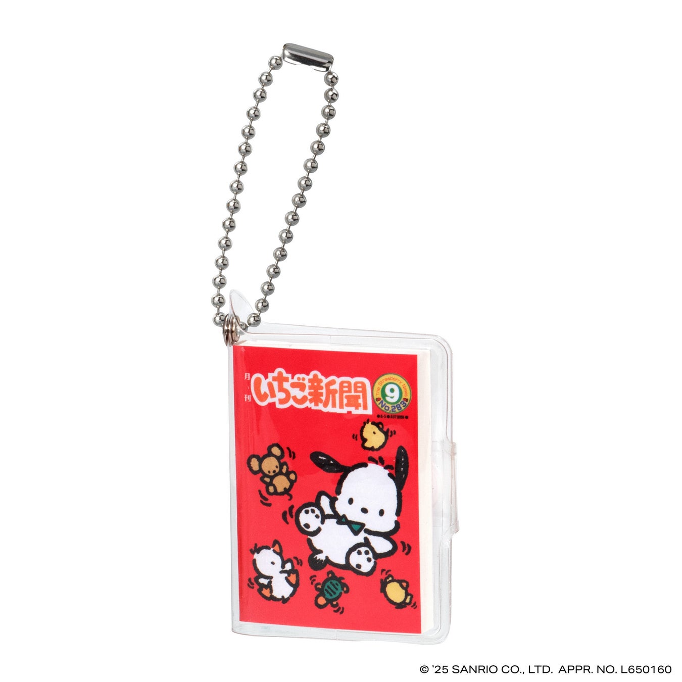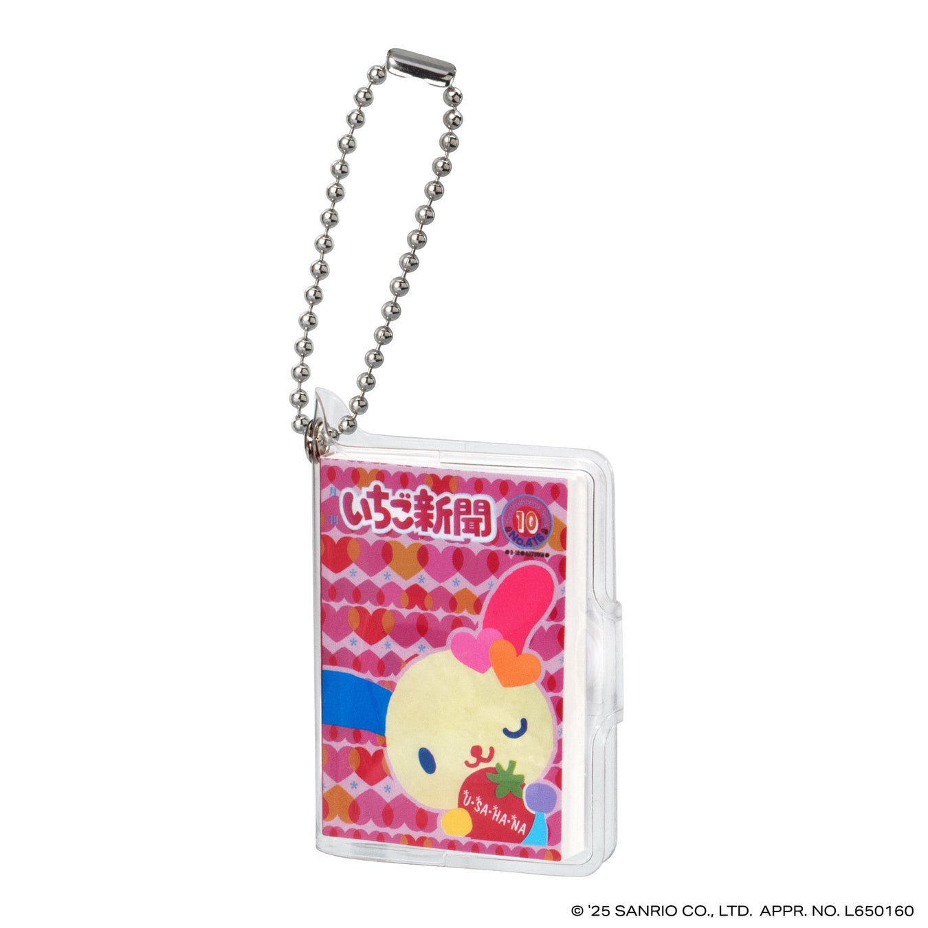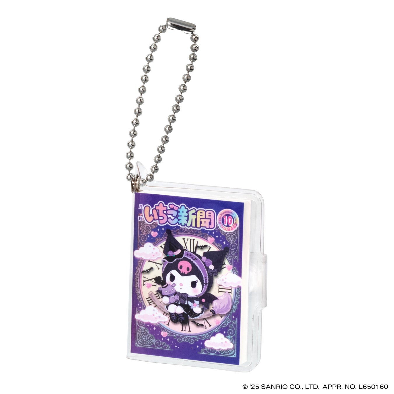 本商品は、今年創刊50周年の機関紙「月刊 いちご新聞」の歴代の表紙をデザインした全高約58mmの豆ノートです。レトロなデザインのハローキティが表紙の「NO.32」、いちごの王さまメインデザインの「NO.34」など、様々な世代に思い入れのある表紙デザインをラインアップし、50年の歴史を感じられます。中のノートはいちご柄のデザインで、実際に書くこともできます。透明カバーとボールチェーン付きなのでチャームとして身につけてもかわいいアイテムです。