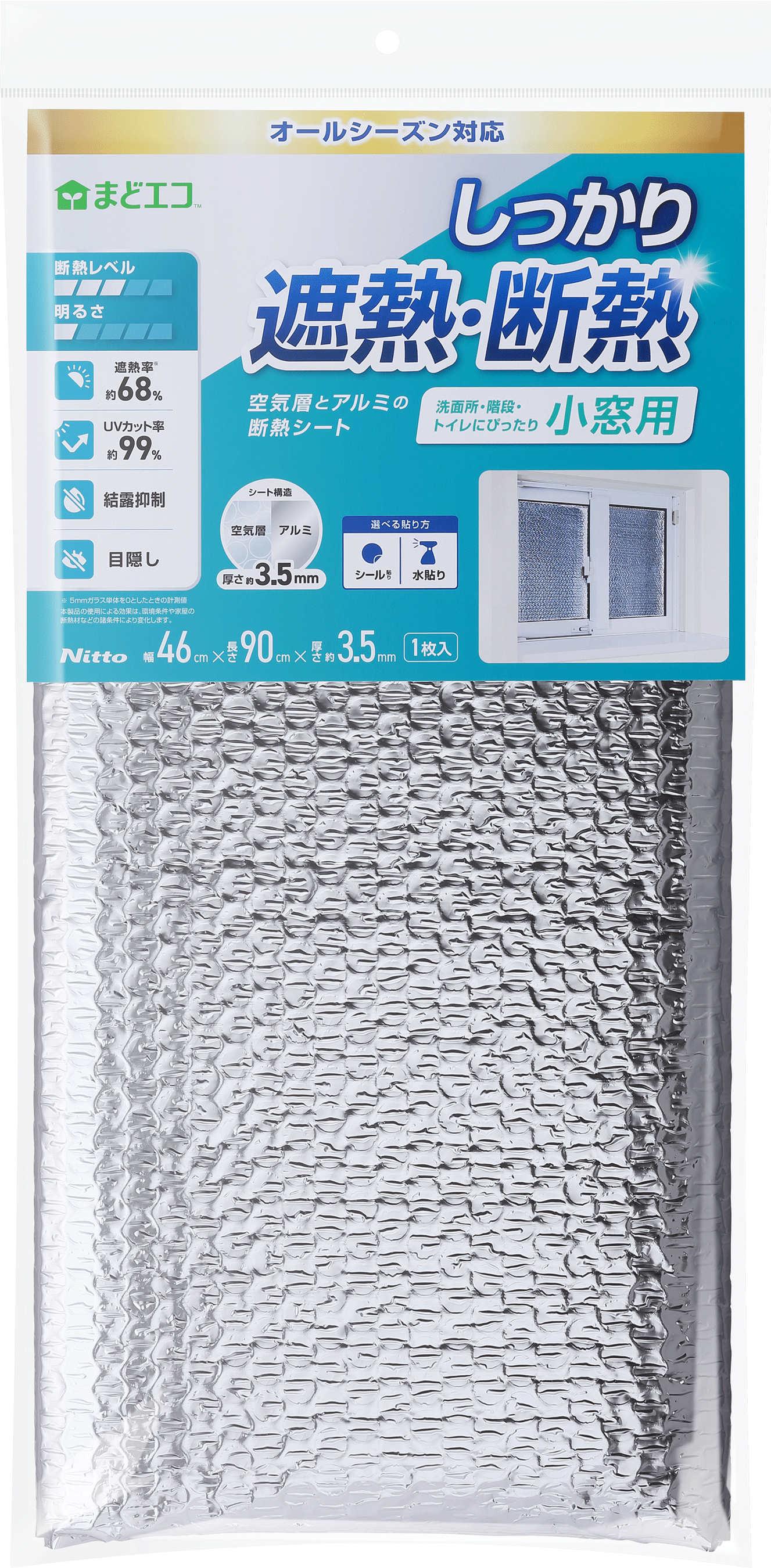 夏の暑さも冬の冷え込みも、アルミの反射と空気層の断熱で快適空間を実現 トイレやキッチンなどの小窓に貼るだけ!1年中使える断熱シート新発売