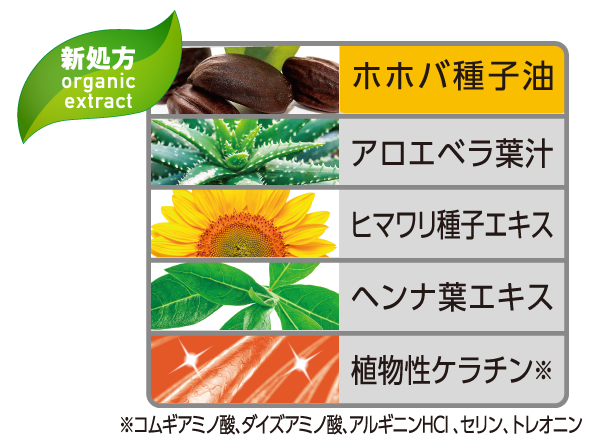 植物成分配合で、髪にうるおいとツヤを与え毛先までダメージ補修。トリートメント効果が高い“ホホバ種子油” でサラサラつやつや!ノンパラベン処方。