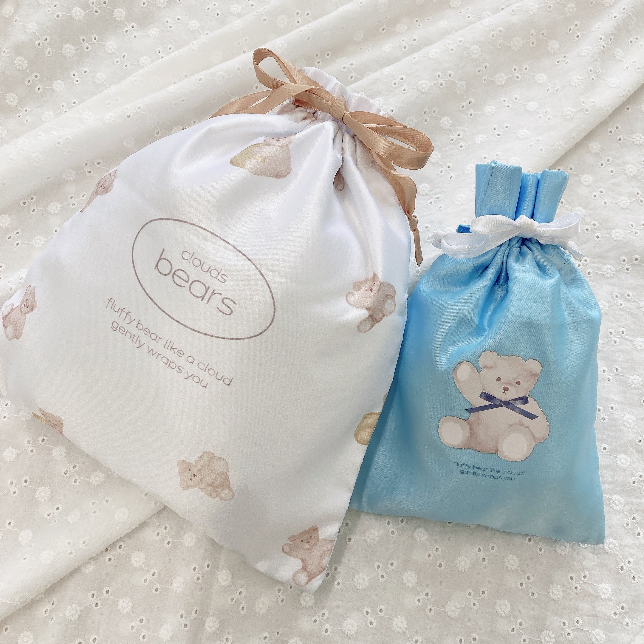 サテン素材が大人っぽかわいい巾着は嬉しい2サイズ展開。セットで持ち歩いても可愛いよう異なるデザインにしています。