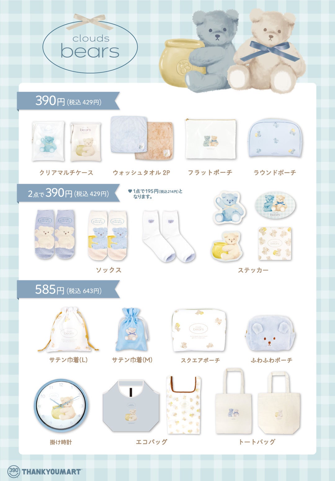 サンキューマートが独自に企画した完全オリジナルデザインの商品シリーズ「サンキューマートオリジナル雑貨シリーズ」より、くまさんデザインの新作『clouds bears』(雲のようにふわふわなくま)を発売します。