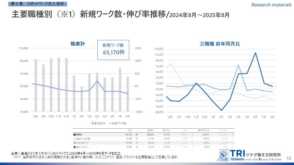 2025年8月度の新規ワーク数は65,170件となり、前年同月比で29.3%減となりました。これにより、4か月連続で前年同月を下回る結果となっています。主要3職種のうち、運送・ドライバーのみが前年同月比で0.2%増となり、唯一前年を上回りました。