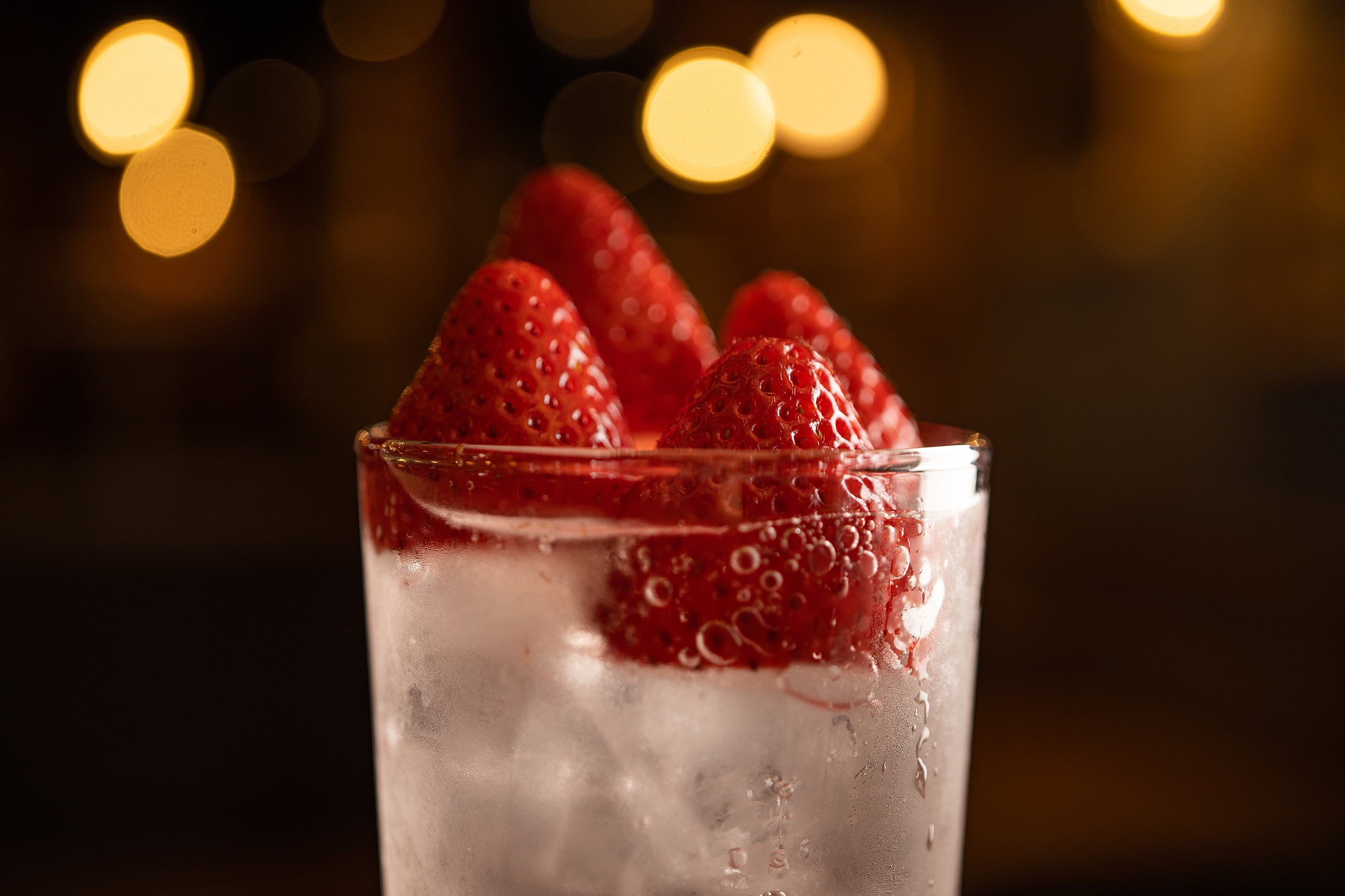 グラスから顔をのぞかせる美しい三角錐のいちごは、静岡県産の「紅ほっぺ」。おいしく色づいたものを収穫し、フレッシュな状態で凍らせています。紅ほっぺの甘酸っぱさが一層引き立つよう、グラスの底のいちご果汁には日向夏シロップを忍ばせました。