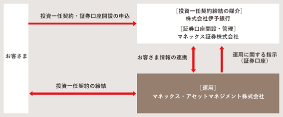 伊予銀行がON COMPASSのサービス案内及び投資一任契約の媒介を行い、マネックス・アセットマネジメントが投資一任運用サービスを提供します。また、お客さまの資産はマネックス証券の口座で管理を行います。