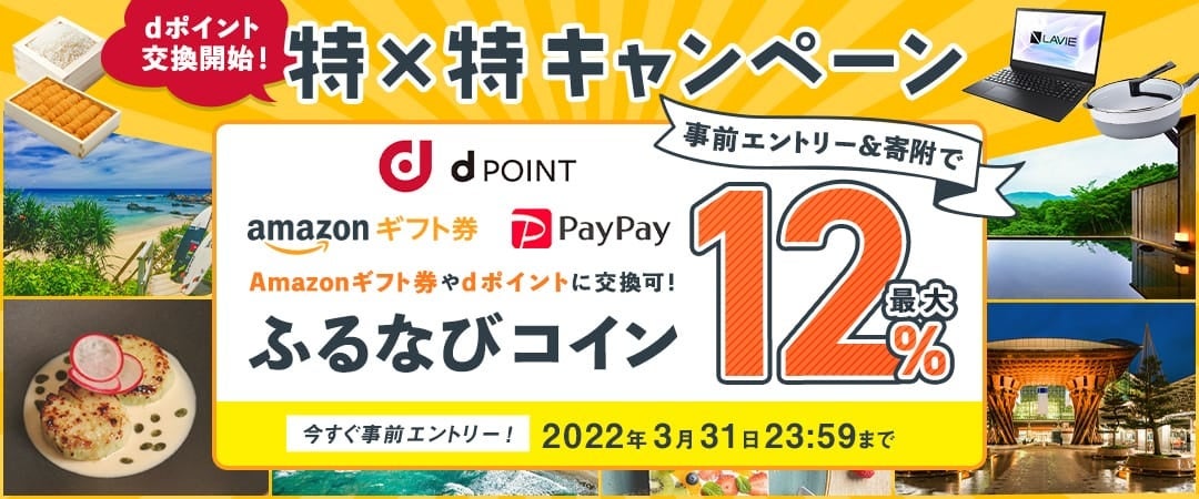 | 【キャンペーン名】最大12%!付与上限なし! dポイント交換開始!特×特キャンペーン 事前エントリー&寄附でふるなびコインがもらえる! 【期間】2022年2年18日(金)12:00~2022年3月31日(木)23:59 【参加条件】 1.ログイン、または新規会員登録(無料) 2.キャンペーンへエントリー 3. ログイン状態にてクレジットカード決済、またはAmazon Payで対象の返礼品に寄附 【注意事項】本キャンペーンは、予告なく中断、中止、変更する場合がございます。 詳細についてはキャンペーンページをご覧ください。 ( https://furunavi.jp/c/cp_present202202 ) |