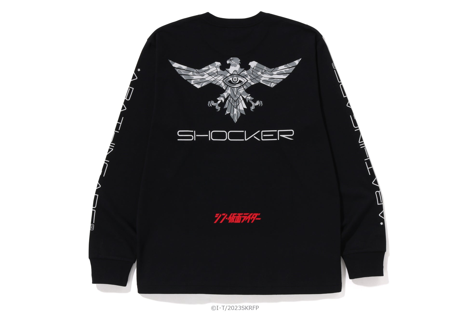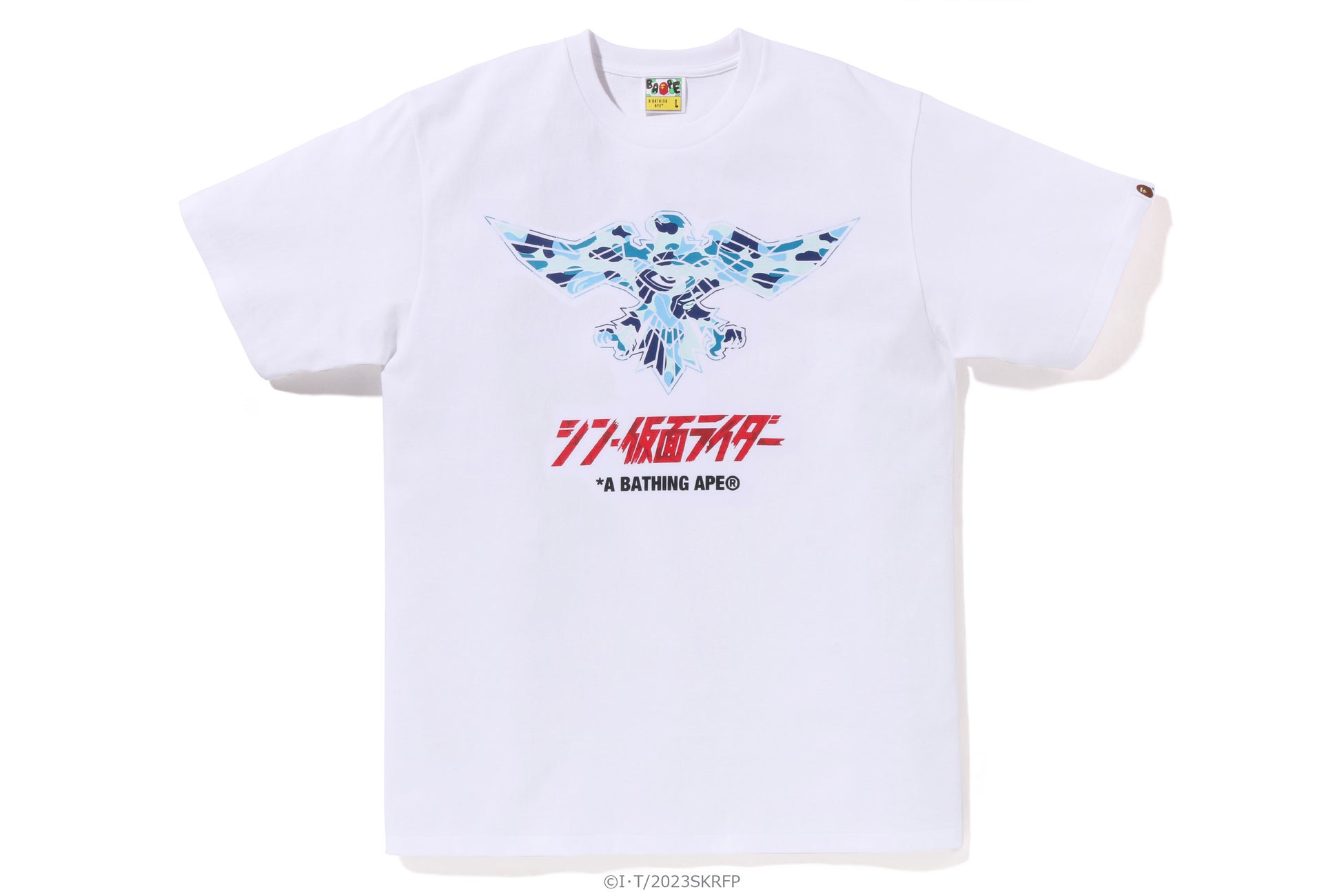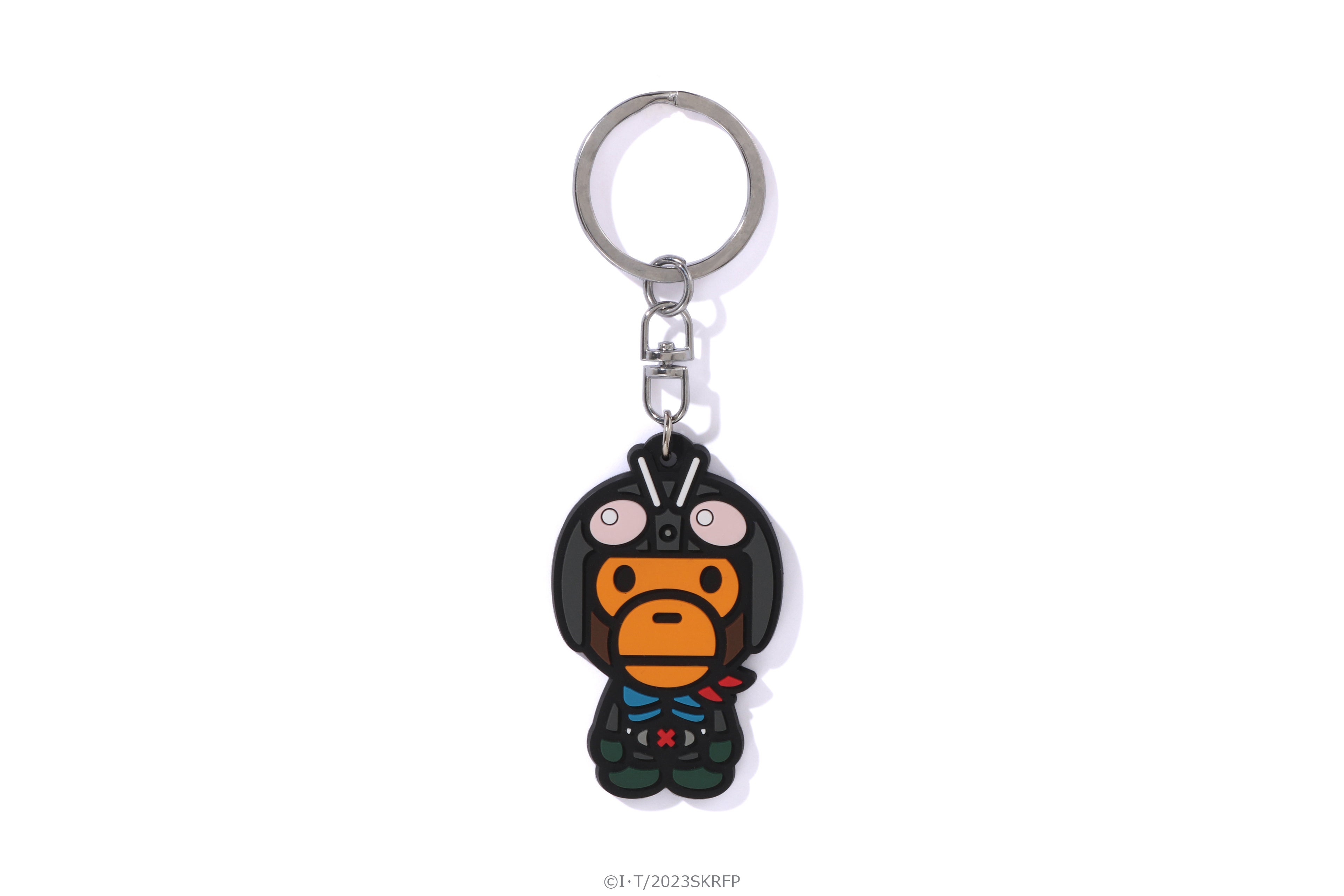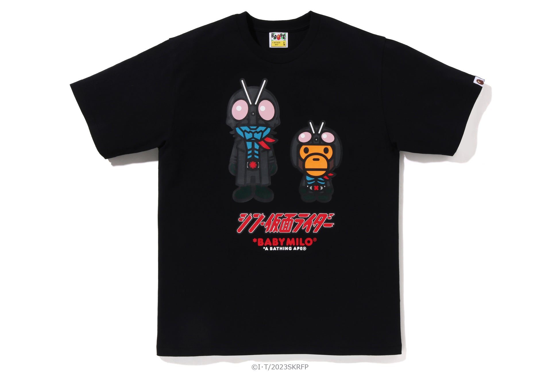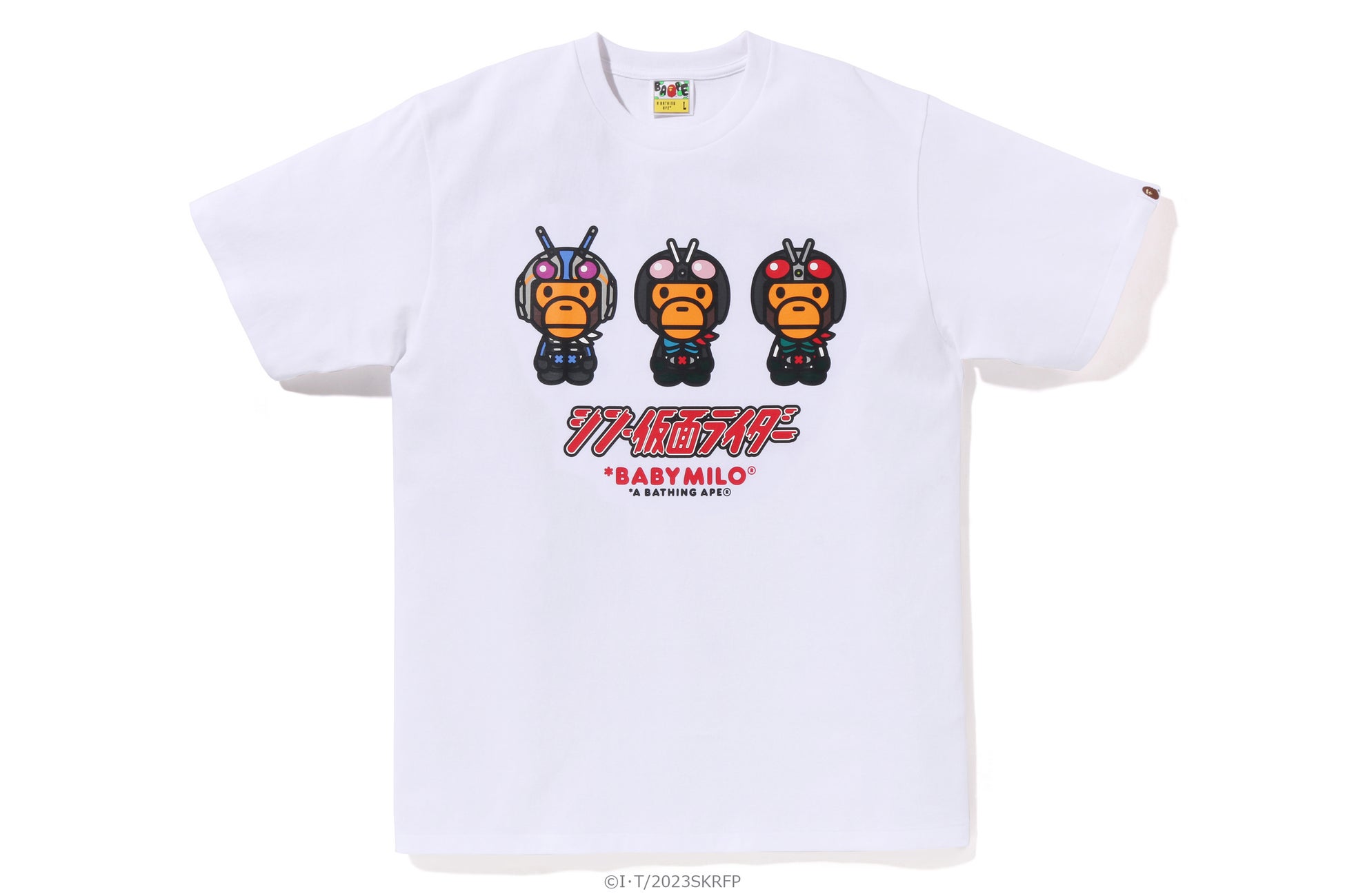 今回のコラボレーションでは、「BABY MILO(ベイビーマイロ)®︎」のタッチでデフォルメされた仮面ライダーをメインビジュアルに採用、さらに定番の「APE HEAD」や「BAPE CAMO」と「SHOCKER(ショッカー)」のモチーフをグラフィックに落とし込んだアイテムなどを展開。Tシャツやスウェットなどのアパレルからキーホルダー、さらに「BABY MILO®︎」シリーズではKIDSラインも用意するなど、デイリーに使えるアイテムを揃えました。