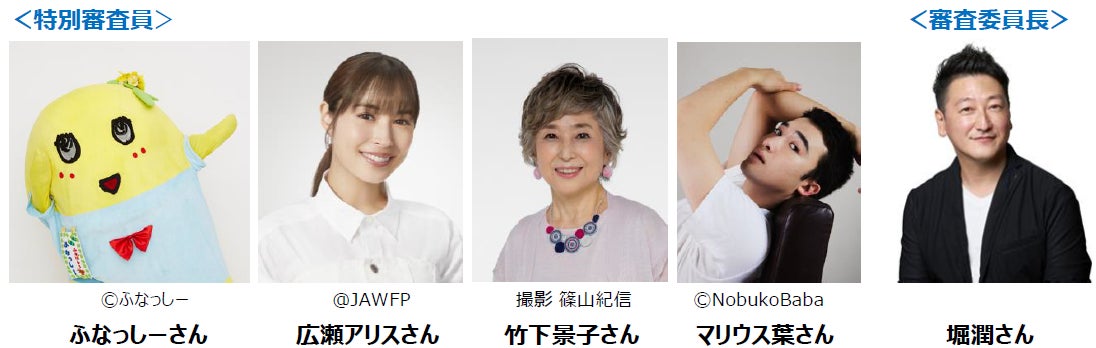 ④新たに「マリウス葉さん」が特別審査員に、審査委員長に「堀潤さん」が就任しました。特別審査員のふなっしーさん、当協会アンバサダーである広瀬アリスさんと竹下景子さんとともに、本コンテストを盛り上げます。