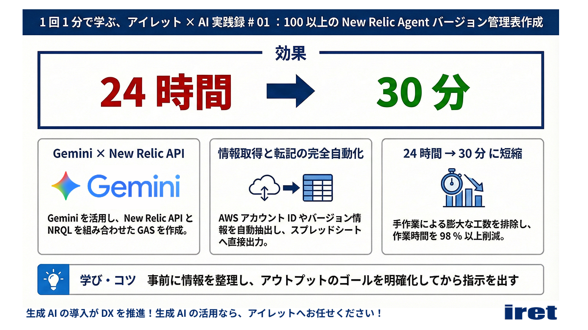 本プロジェクトでは、アイレットのエンジニア、デザイナー、バックオフィス担当など多種多様な職種の社員が日々実践している「小さな工夫」から「高度な自動化」までを、1分で読めるインフォグラフィックにて紹介します。