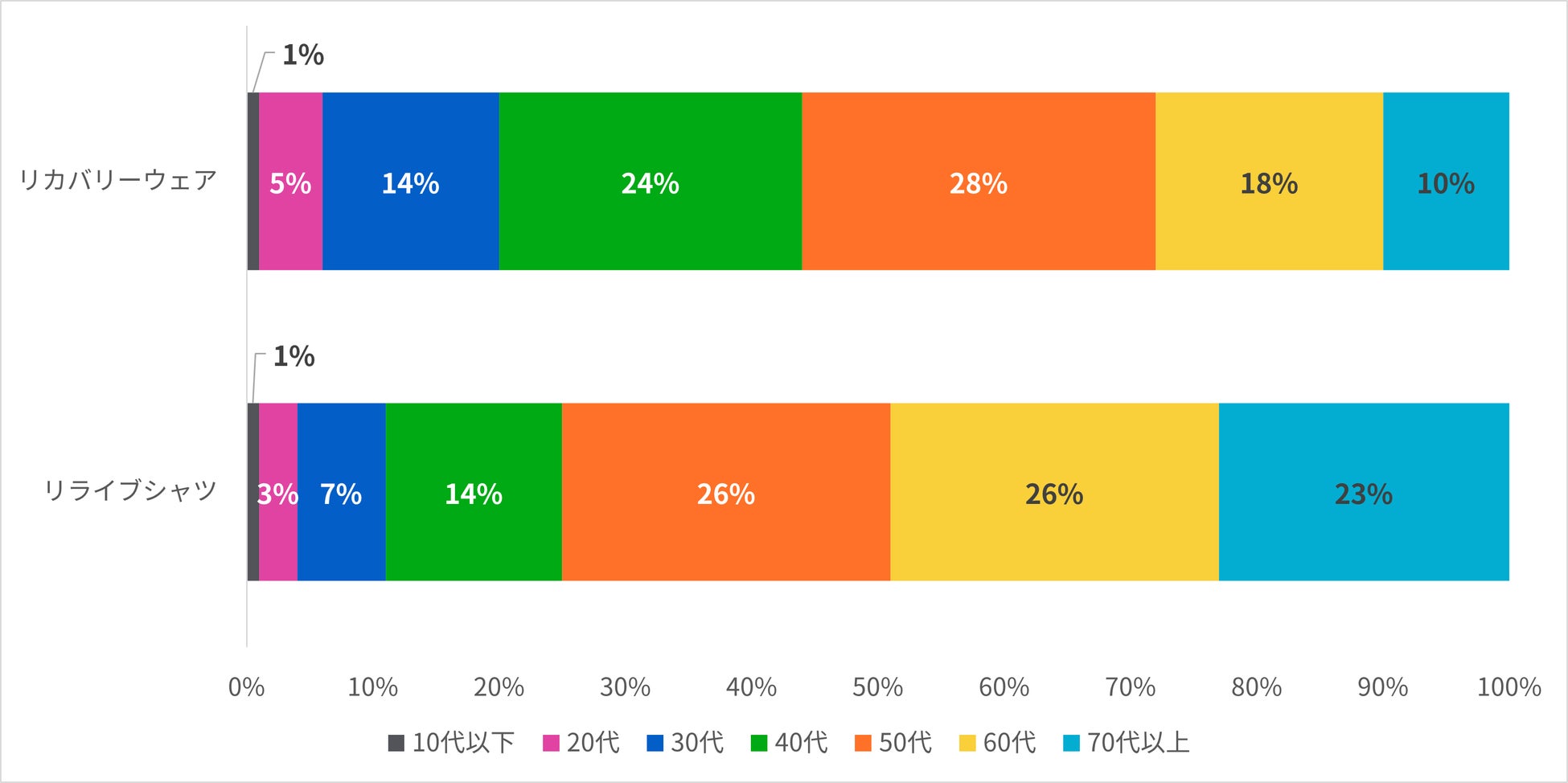男女・年代別の割合を見てみると、「リカバリーウェア」に比べて「リライブシャツ」の検索は男性の割合が高くなっています。年齢層は「リカバリーウェア」が30-40代を主流に検索されているのに対し、「リライブシャツ」はそれより上の年代となる50-70代に響いており、現在60歳の出川哲朗さんが体験談的にレポートするCMと、商品の検索層がマッチしていることがわかります。