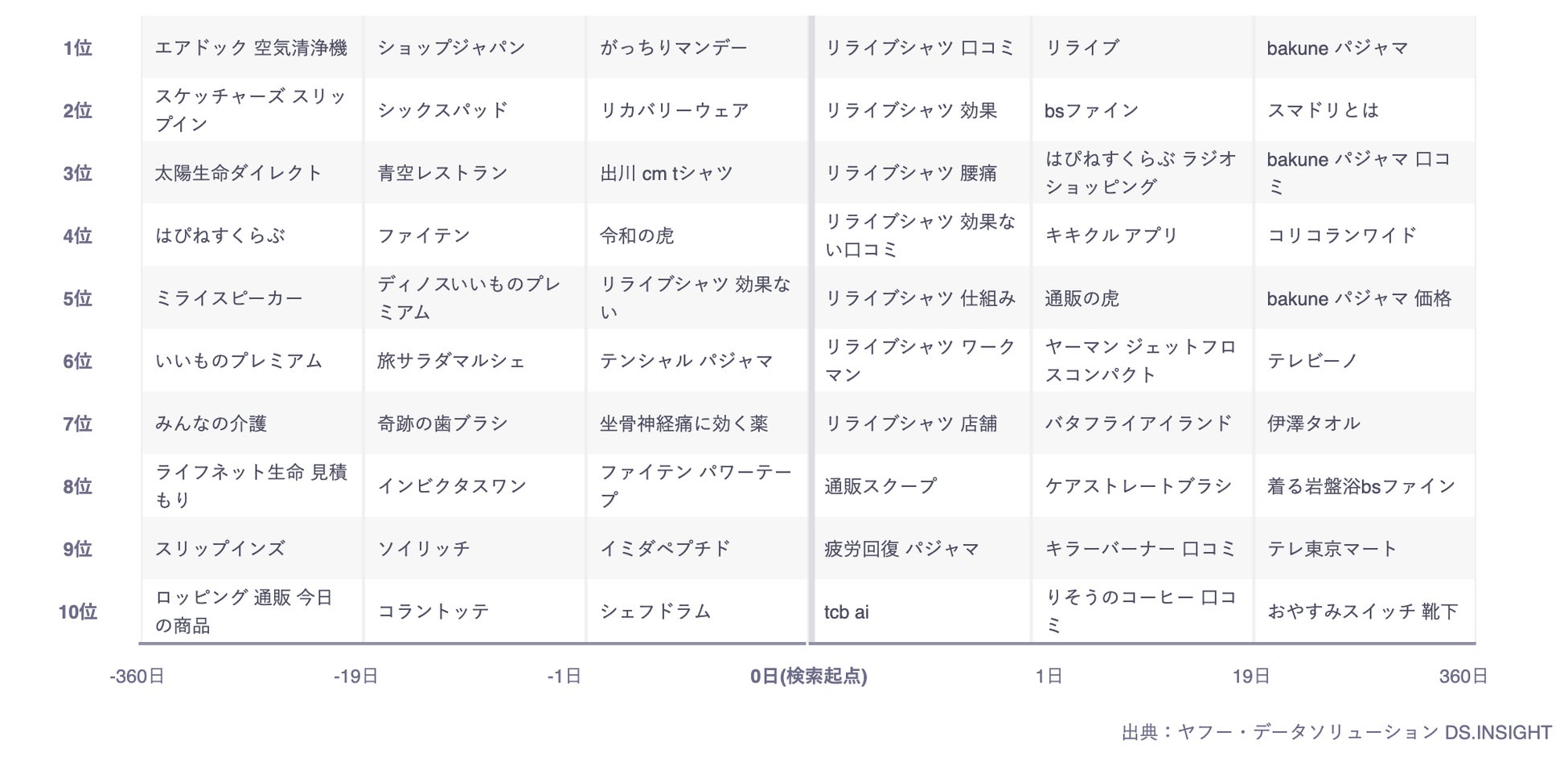 「リライブシャツ」と検索した人の時系列キーワードには、検索起点より前では健康関連の商品や通販情報、保険関連などが多く見られる他、番組内でリライブシャツを取り上げた「がっちりマンデー」が至近の上位にきていることから、番組をきっかけに「リライブシャツ」を検索した人も多かった様子が推察されます。起点日以降は商品特性や他のリカバリーウェアの検索も増えており、消費者が比較検討をし始める行動が見えて来るようになります。