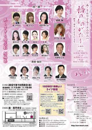 あ・うん♡ぐるーぷ『美しすぎる時代劇 短編集 <橋のものがたり>三部作』が2021年10月8日(金) に座・高円寺2(東京都杉並区)にて上演されます。チケットはカンフェティ(運営:ロングランプランニング株式会社、東京都新宿区、代表取締役:榑松 ⼤剛)にて9月5日(日)より発売開始です。