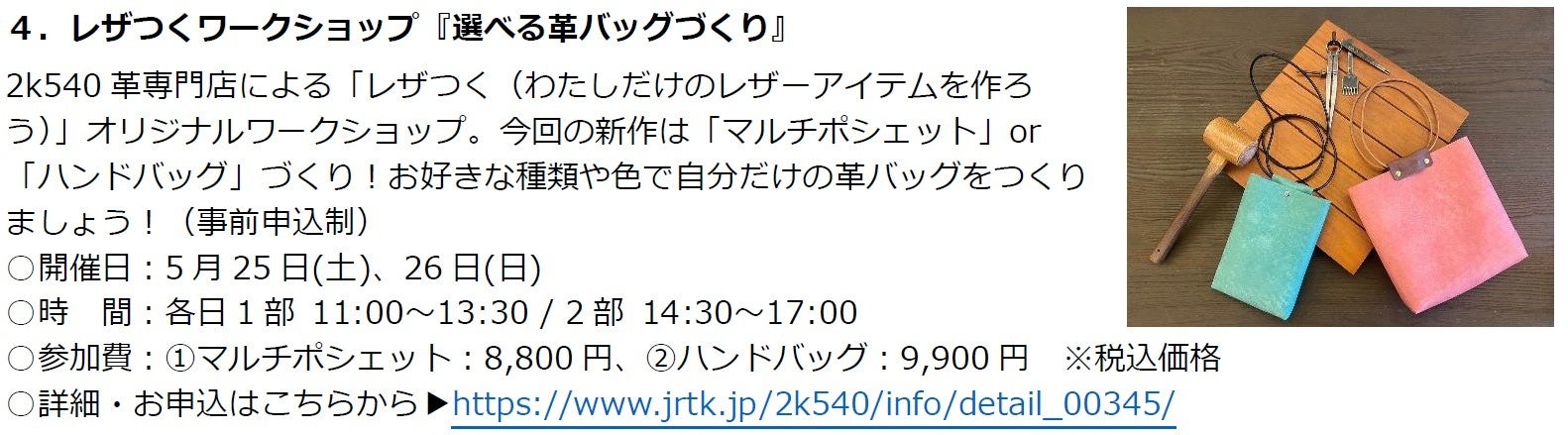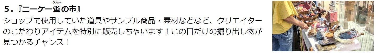 ■この度、今年のイベントラインナップが決まり、当イベントオリジナル企画に加え、各ショップ別のイベントも実施いたします。イベント企画の一つである、『選べる革バッグづくり』は、参加事前申込の受付を開始いたしました。
