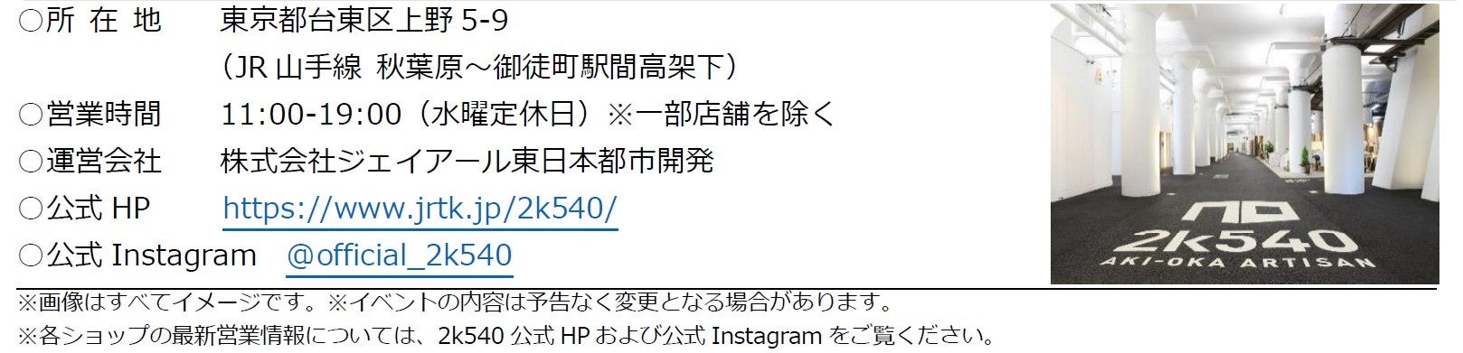 ・開催場所:2k540 AKI-OKA ARTISAN(東京都台東区上野5-9/ JR山手線 秋葉原~御徒町駅間高架下)