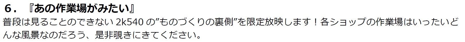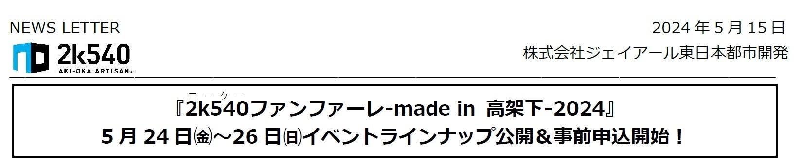 ■JR秋葉原~御徒町駅間高架下にある“日本のものづくり”がコンセプトの商業施設『2k540 AKI-OKA ARTISAN(ニーケーゴーヨンマル アキオカ アルチザン)』(以降、「2k540」)では、2024年5月24日㈮から26日㈰までの3日間、『2k540(ニーケー)ファンファーレ -made in 高架下-2024』と題し、ものづくりを体験し、楽しんでいただけるイベントを開催いたします。