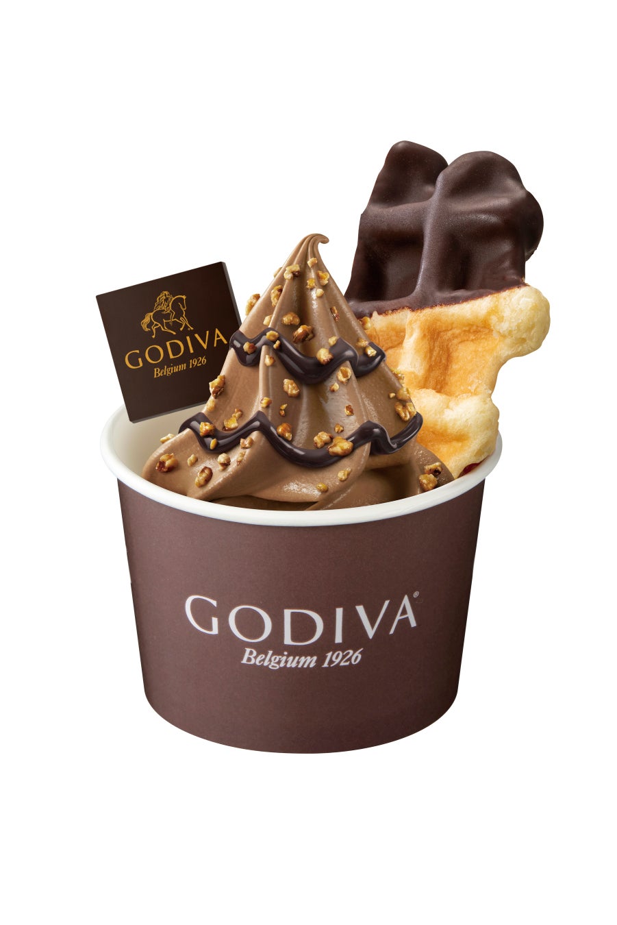そのほか、ゴディバのチョコレートをディップしたベルギーワッフルに、ソフトクリームを合わせた「ベルギーワッフル&ソフトクリーム」がラインナップされています。また、店舗でゴディバのチョコレートをディップする、ダーク、ミルク、ホワイトの3種類の「ベルギーワッフル」もご用意しました。