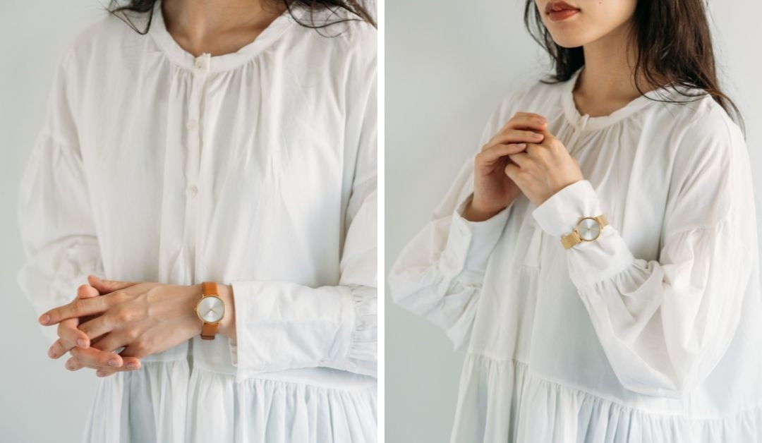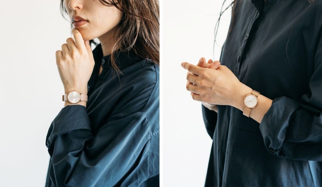 シンプルなダイヤルのデザインはレザーストラップとメッシュストラップで表情を変えてお楽しみいただけます。