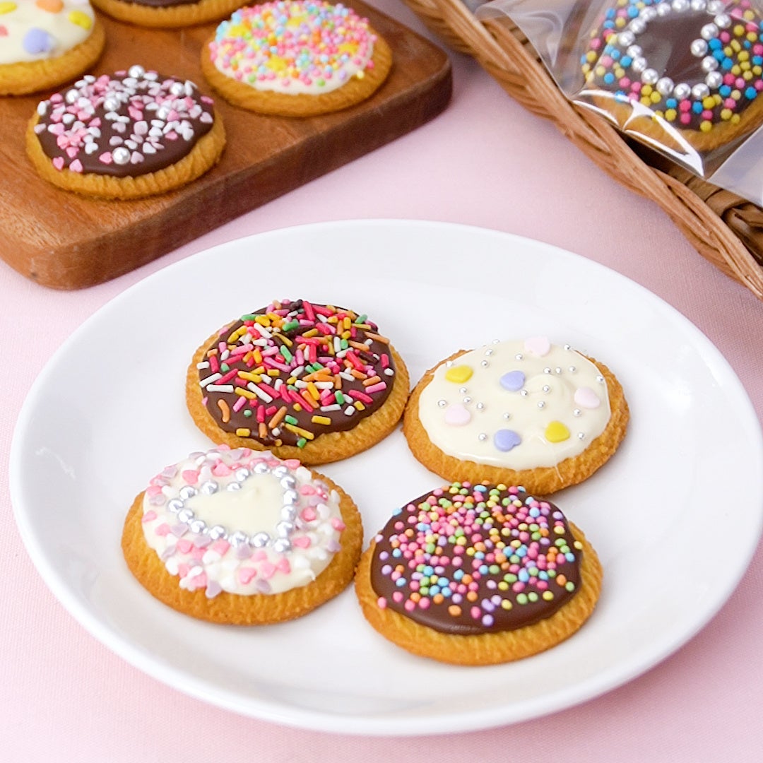 市販のクッキーとアラザンやチョコスプレーをデコレーションを使って簡単に可愛く仕上げましょう!2色のチョコレートを使うことで彩りもよく仕上がります!バレンタインに作って配るのもおすすめです。