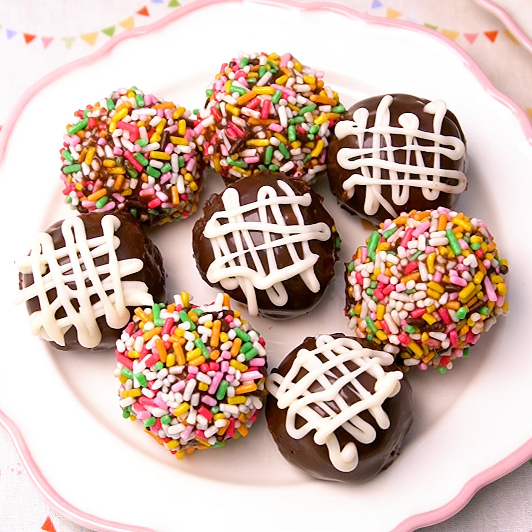 砕いたビスケットを丸めて溶かしたチョコをからめます。材料3つとお好みのトッピングでお楽しみください!ねっとりと濃厚な味わいです。