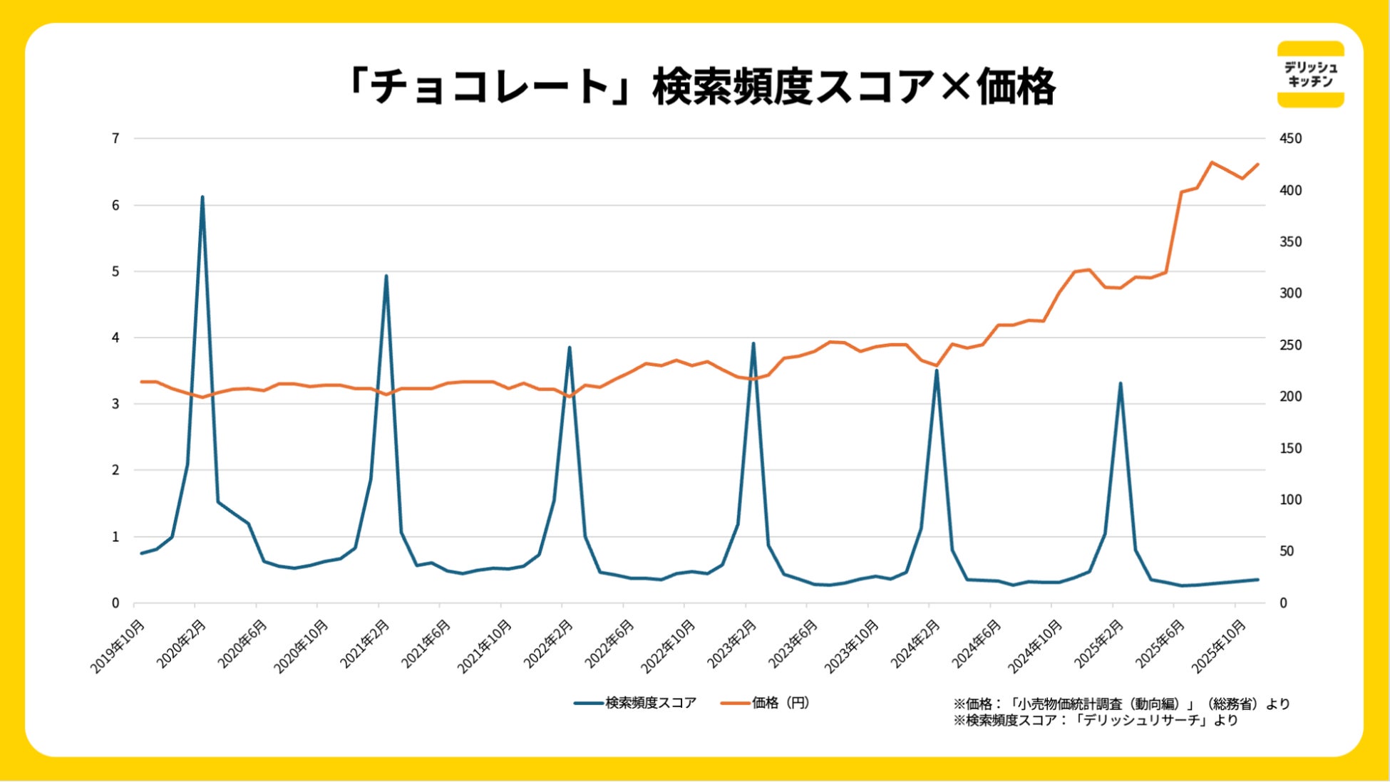 トレンドが盛り上がりを見せる一方で、家計に大きな影を落としているのが、チョコレートの価格高騰です。総務省発表の「小売物価統計調査(動向編)」によると、2025年10月時点の価格(100g換算)は、2019年同月比で約2倍まで上昇しています(2025年10月:411円、2019年10月:214円)。一方で、バレンタインシーズンである2月における、「チョコレート」のキーワード検索頻度は年々減少傾向にあります。