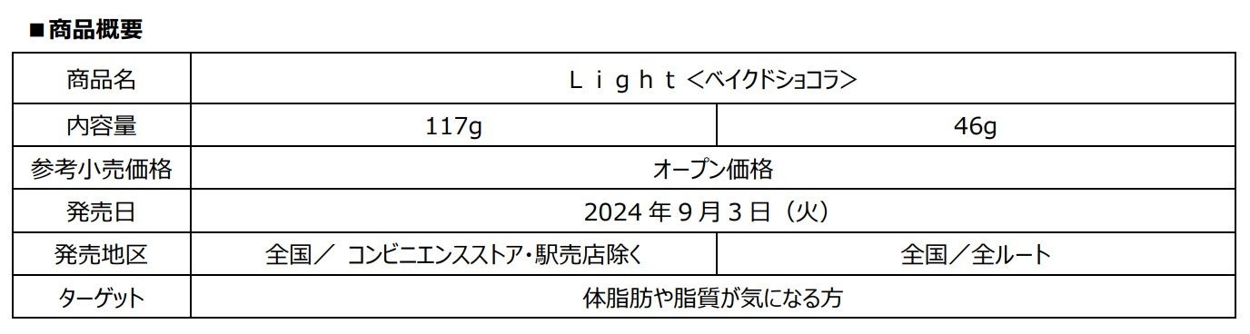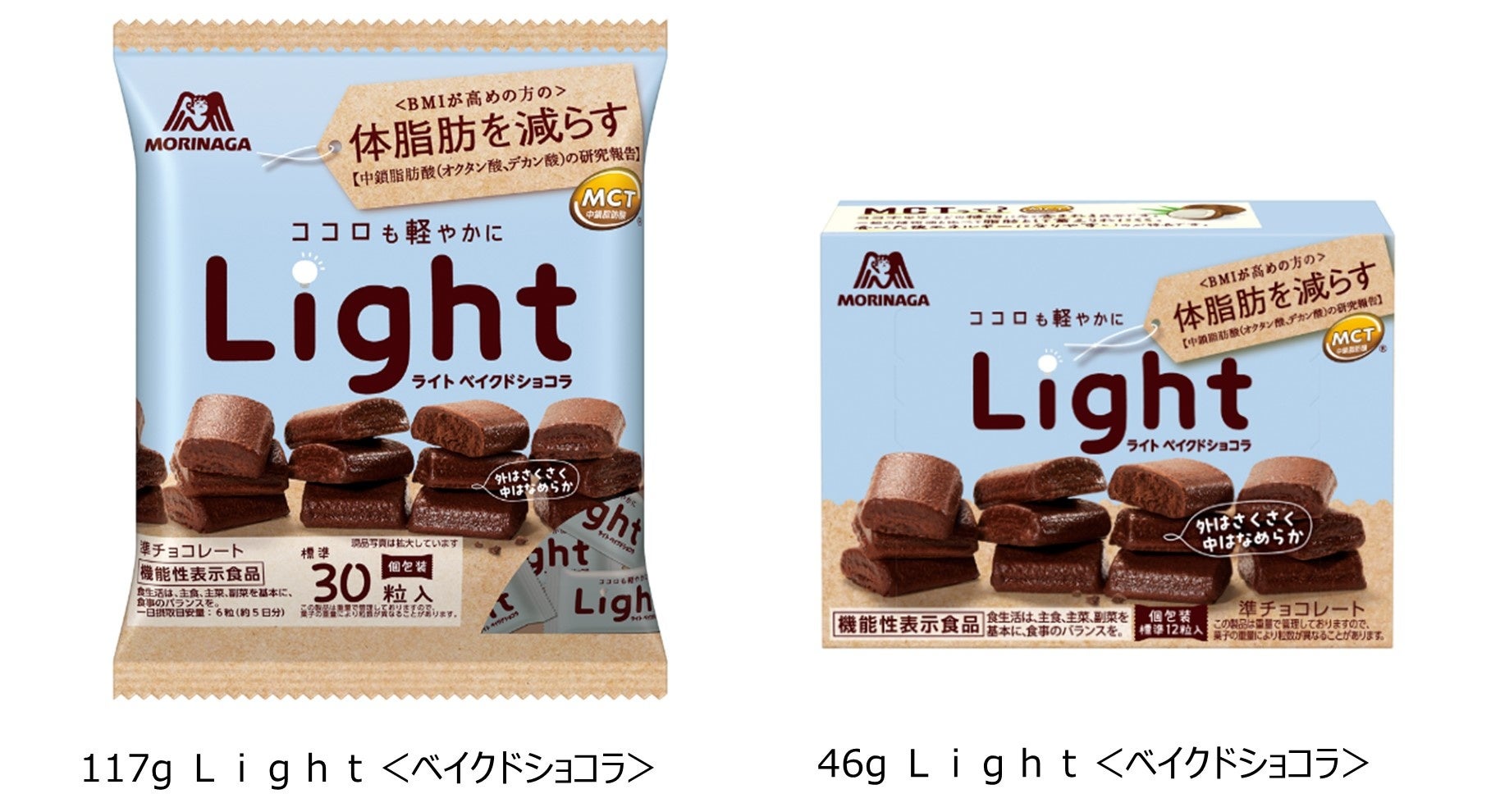 「Light<ベイクドショコラ>」は、製品中MCTオイルを10%使用しており、チョコの甘さや香りでココロも軽やかに気持ちを明るく照らすベイクドチョコレートです。本品には中鎖脂肪酸(オクタン酸、デカン酸)が含まれます。中鎖脂肪酸(オクタン酸、デカン酸)はBMIが高めの方のウエスト周囲径の減少、体脂肪や内臓脂肪を減らすことが報告されています。MCTオイルを使用した外側サクサク、内側なめらか食感のベイクドチョコレート「Light<ベイクドショコラ>」の発売で、お客様のウェルネスライフをサポートしてまいります。