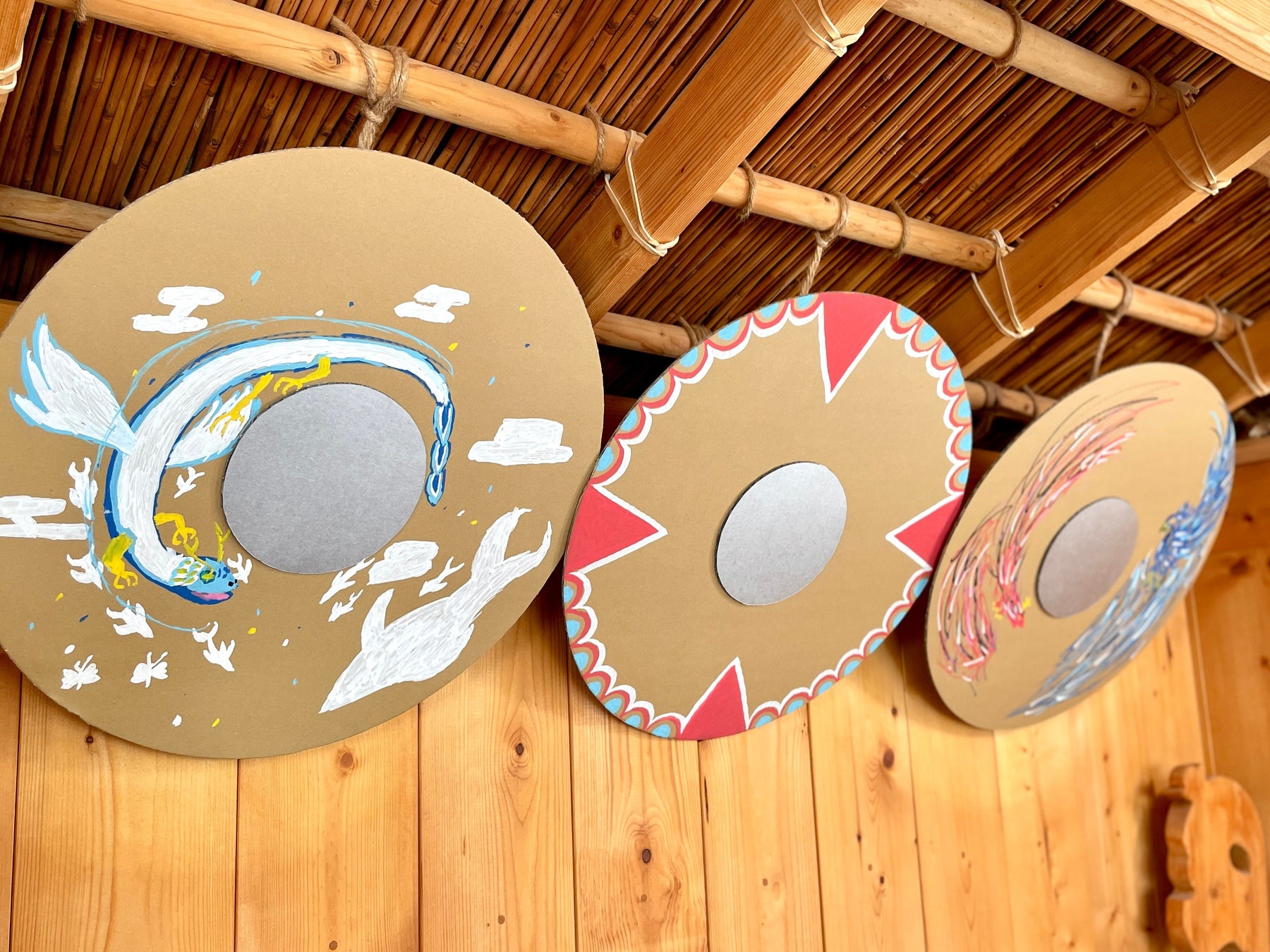 ダンボールに大きく模様を描いて、世界にひとつのヴァイキングシールド作り。作った盾を使って、みんなで並んでシールドウォール(盾の壁)の実演発表会も!