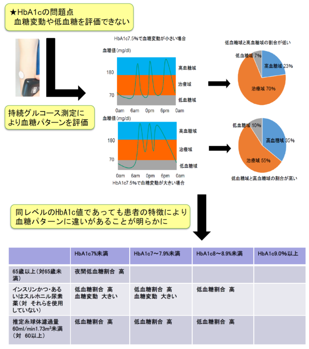 - 持続グルコース測定にて血糖パターンを評価することは最適化医療の実現の一助に