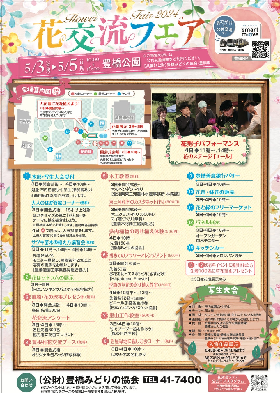 GW後半の初日、5月3日(金・祝)からは、「花交流フェア2024」が豊橋公園を会場に開幕します。5日まで3日間です。手作り花壇の展示など、公園を花と緑が彩彩ります。1996年から毎年開催され、見て体験できる花の祭典です。