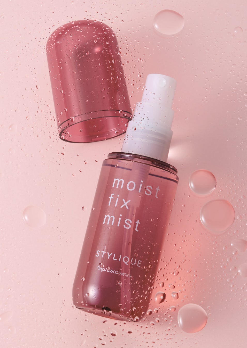 「スタイリーク モイストフィックス ミスト」には、加水分解コメヌカエキス、当社オリジナル成分のハイブリッドローズ花エキス、パウダルコ樹皮エキス/タベブイアインペチギノサ樹皮エキスといった植物の保湿成分に加え、美容オイルのスクワラン、天然ビタミンE/トコフェロール、セラミド/セラミドNG、マルチコラーゲン/サクシノイルアテロコラーゲンなどの保湿剤を配合。加えて、うるおい定着成分※1を配合しているので、木枯らしが吹く季節にも潤いをたたえたつや肌をキープ。肌の乾燥や、乾燥からくるごわつきや肌の白い粉吹きなどから防ぎ、ファンデーションの浮きやひび割れを防ぎ、きれいな表情を保ちます。エアコンなどから感じる肌の乾燥にも対応するので、仕事場や外出先での化粧直しの仕上がりを引き上げます。