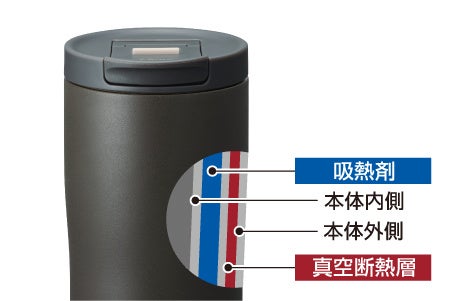 飲みやすい温度をキープする、真空2重構造の内側に吸熱剤を入れたステンレス3層構造になっています。
