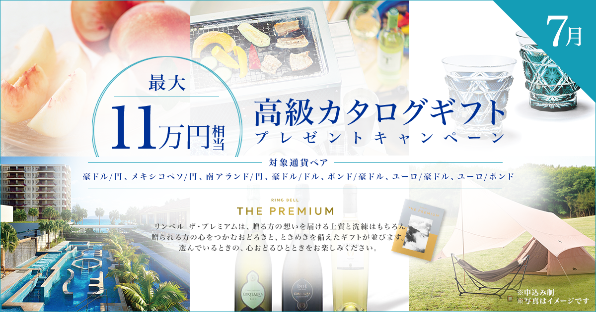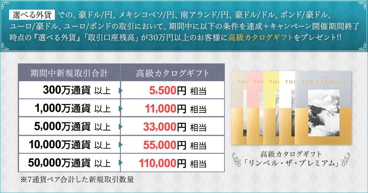 本キャンペーンにお申し込みいただき、『選べる外貨』での対象通貨ペア(豪ドル/円、メキシコペソ/円、南アフリカランド/円、豪ドル/ドル、ポンド/豪ドル、ユーロ/豪ドル、ユーロ/ポンド)のお取引において、期間中に以下の条件を達成され、かつ、キャンペーン終了時点の『選べる外貨』取引口座残高が30万円以上の方を対象に、7通貨ペアの新規取引数量合計に応じて最大11万円相当の高級カタログギフト(『リンベル ザ・プレミアム』)をプレゼントいたします。