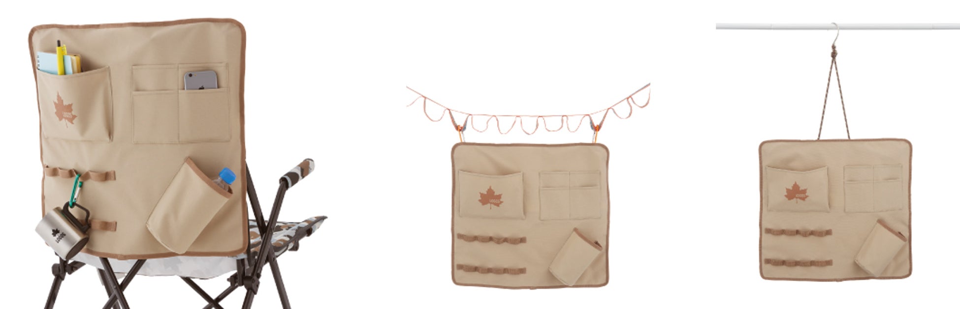 「マルチストレージカバー」は、チェアにかぶせて便利に使える背面ポケットです。かぶせるだけでチェアの背面が小物入れに早変わりします。数種類のポケットが付いているため、細々したアウトドアの小物を整理整頓できるほか、チェアの背面はもちろんハンガーの内側など様々な場所で吊るせるので、幅広いシーンで活躍します。