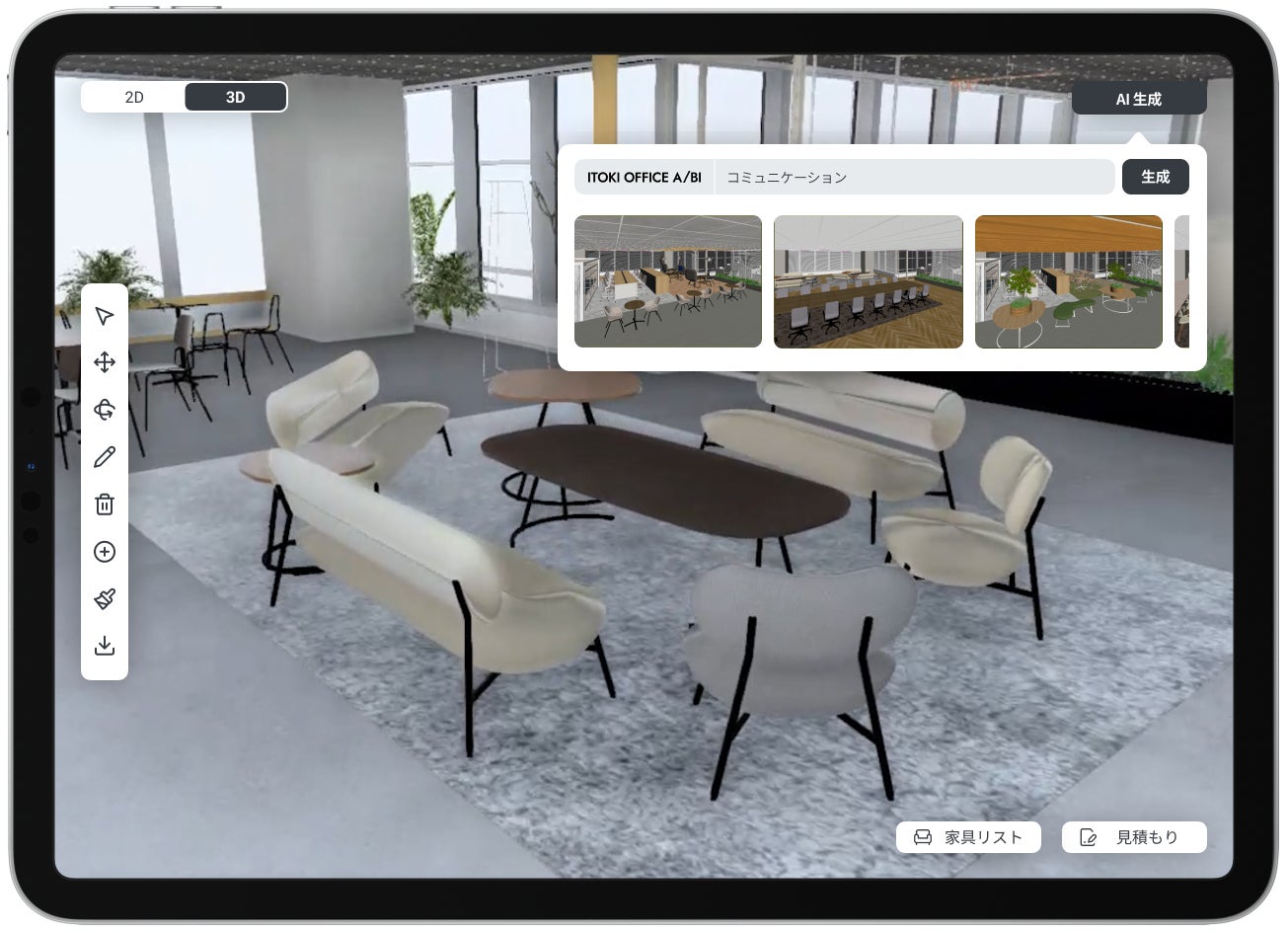 共同開発を進めるオフィスデザイン自動生成AIは、「ITOKI OFFICE A/BI PLATFORM」*に蓄積されたオフィスレイアウトなどのデータをもとに、様々なパターンのオフィスを自動でデザインすることができる生成AIです。また、燈の空間スキャン技術を活用し、デジタルツインを迅速に構築する技術を確立することで、オフィスデザインを瞬時にシミュレーションできるアプリケーションを開発します。これにより、従来膨大な工数と時間を費やしていた、オフィス内の寸法測定などのアナログ作業をこのアプリケーションを用いた撮影で大幅に軽減し、オフィスデザインの初期の提案活動をよりスピーディーにします。お客様の人的資本経営の鍵となるアジャイルなオフィス構築に求められる、よりクイックで機動的なリニューアルの実現に貢献してまいります。