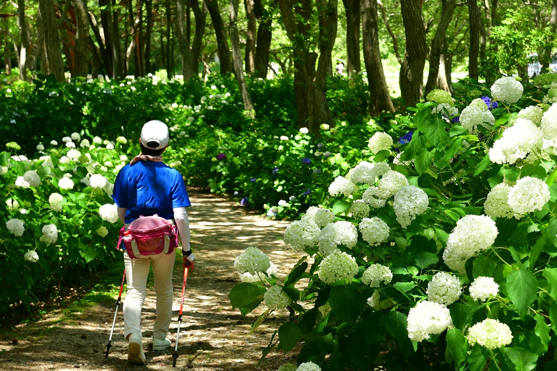 国営ひたち海浜公園の「ひなの林」では、約550株のアジサイ・アナベルが見頃を迎えました。今年の見頃は6月26日から7月10日頃まで続くと予想しています。雑木林の下で、純白の装飾花(ガク)を手毬状に咲かせるアナベルは、木々の木漏れ日を受けて輝き、初夏の風景を演出しています。