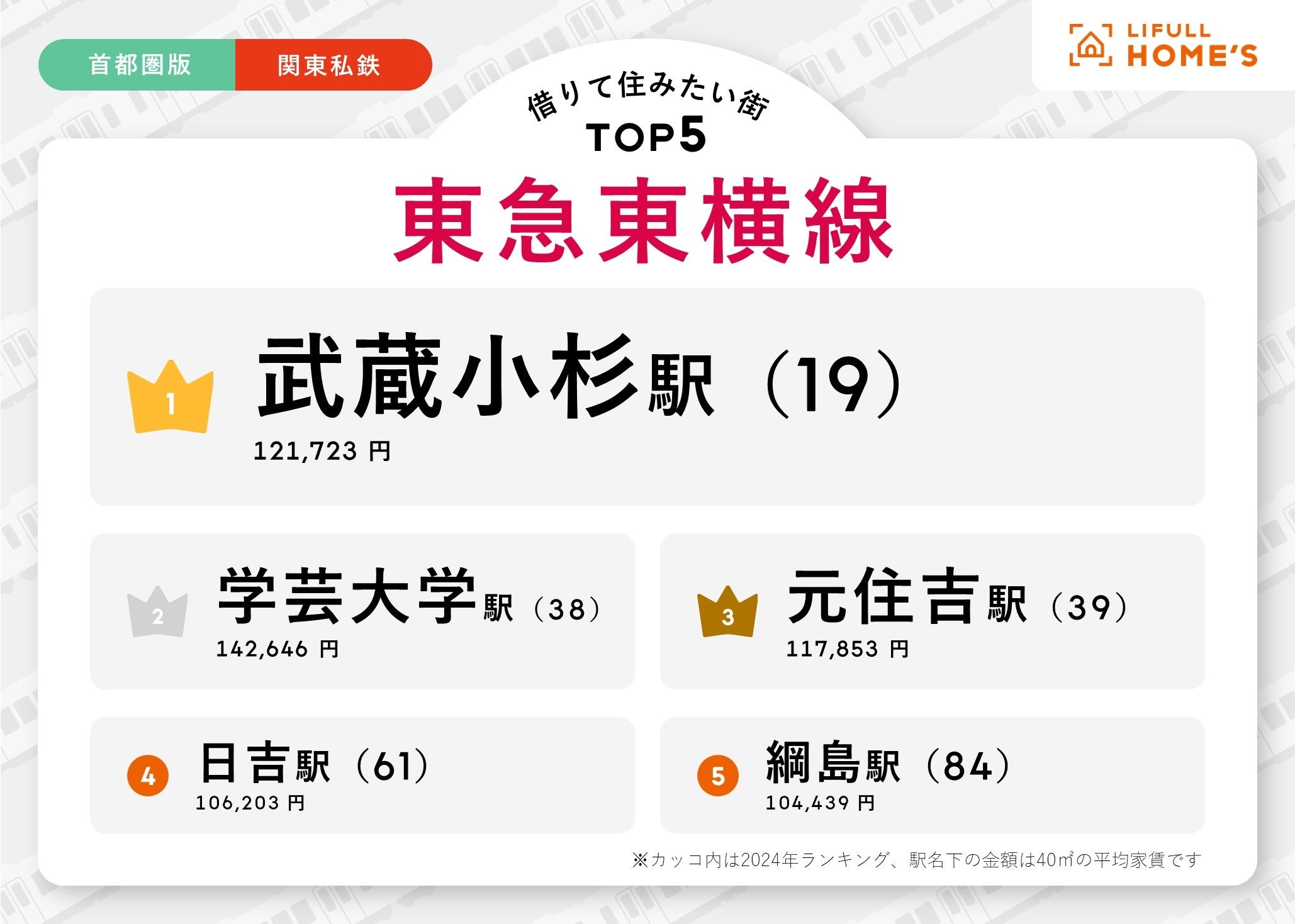 1位「武蔵小杉」(神奈川県川崎市中原区)は、「渋谷」と「横浜」の中間に位置し、JR埼京線、湘南新宿ラインなどへの乗り換えができ、マンションが多くあり、東京の都心や横浜市内への通勤通学する方に人気の街です。2位「学芸大学」(東京都目黒区)は、「渋谷」から約10分、TOP5のなかで唯一の東京都内の駅です。商店街や深夜まで営業するスーパーがあり買い物がしやすい一方で閑静な住宅街がある街です。3位「元住吉」(神奈川県川崎市中原区)は、商店街や個人商店、大型スーパーがあり、大きな公園も多くファミリー層にとって暮らしやすい街です。「武蔵小杉」から横浜側に一駅のため、通勤通学をする方にも見逃せない街です。