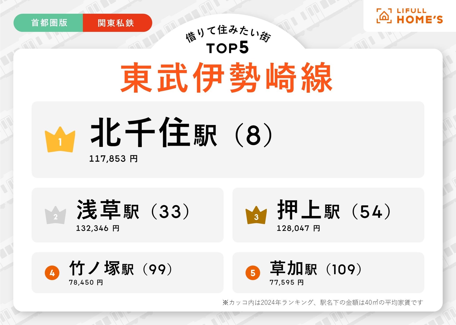 「住みたい街が多い鉄道路線ランキング・首都圏私鉄編」の5位は東武伊勢崎線です。東武伊勢崎線の住みたい街ランキングは、1位「北千住」(借りて住みたい街ランキング首都圏版8位)、2位「浅草」(同33位)、3位「押上」(同54位)、4位「竹ノ塚」(同99位)、5位「草加」(同109位)となりました。東武伊勢崎線は、TOP200内に8駅がランクインしています。東京都台東区の「浅草」から群馬県伊勢崎市の「伊勢崎」を結び、首都圏では埼玉県の「羽生」までです。TOP5のうち4駅は、都心の駅がランクインしました。1位「北千住」(東京都足立区)は、東武伊勢崎線のほか、JR常磐線や東京メトロ日比谷線、千代田線、つくばエクスプレスの複数路線が利用できる交通利便性が高い駅です。また都内でありながら比較的賃料水準が安価なエリアで生活コストを押さえながら暮らせる街です。2位「浅草」(東京都台東区)は、東武伊勢崎線と東京メトロ銀座線の始発駅で座って通勤したい方には見逃せない駅です。観光地としての賑わいがあるのはもちろん、お酒が飲めるお店が充実しているため外食が好きな人に向いている駅です。また少し中に入ると住宅街があり、東京の下町の風情を感じることができます。3位「押上」(東京都墨田区)は、東武伊勢崎線のほか、都営浅草線と東京メトロ半蔵門線と京成押上線の始発駅です。墨田区にあり東京の下町の風情を色濃く残した街です。また、2012年に開業した東京スカイツリー®の最寄りとしても知られます。東京ソラマチと呼ばれる商業施設が併設され徒歩圏内でショッピングを楽しめます。東京ソラマチ以外にも、大小いくつかのスーパーがあるので、普段の買い物で困ることはありません。
