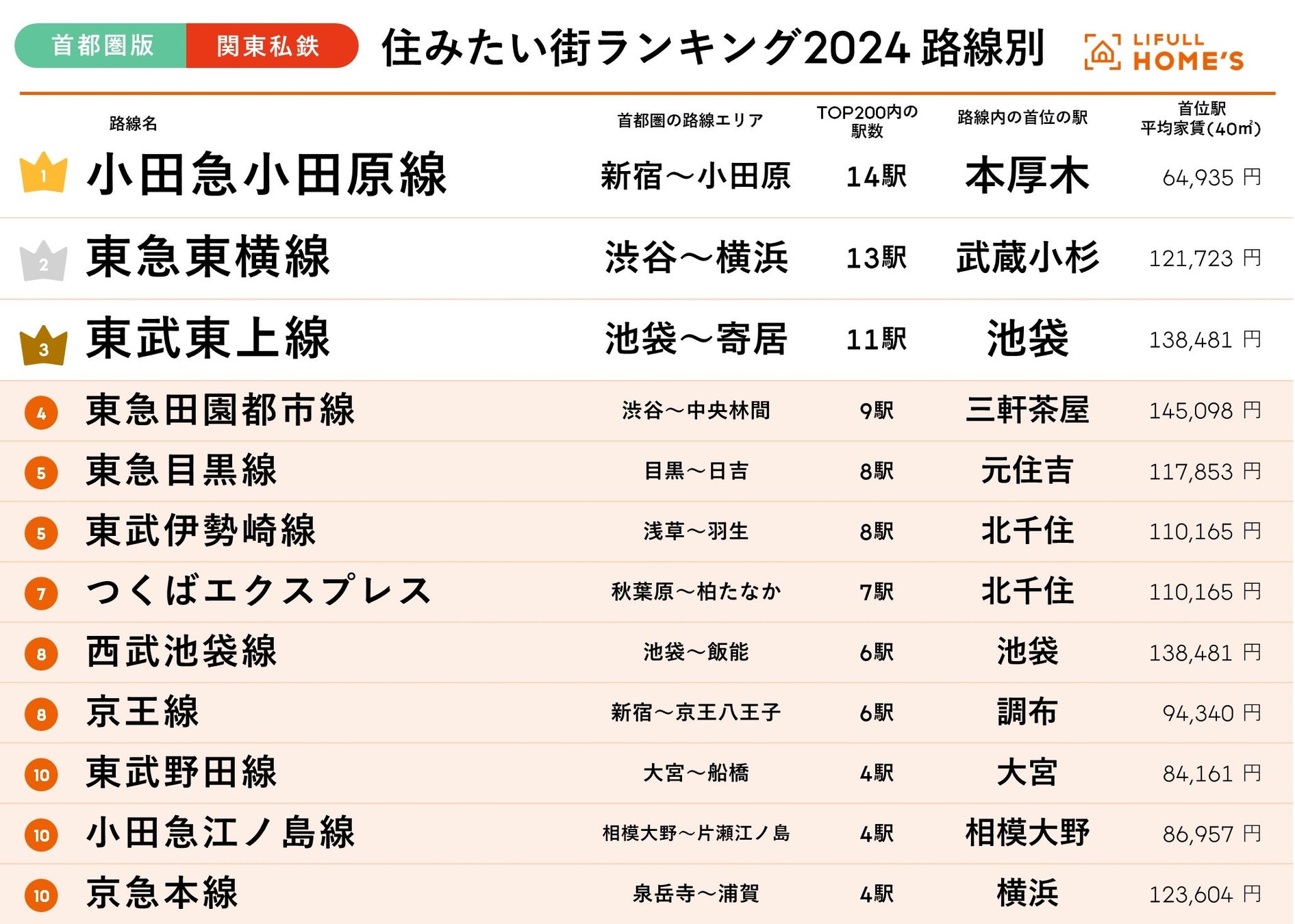 首都圏における「借りて住みたい街ランキング」TOP200内の駅と路線を対象に私鉄の路線別に集計した、「住みたい街が多い鉄道路線ランキング首都圏・私鉄編」では14駅がランクインした小田急小田原線が1位となりました。2位は東急東横線(TOP200内にランクインした数:13駅)、3位は東武東上線(同11駅)が続きます。4位は東急田園都市線(同9駅)、5位は東急目黒線、東武伊勢崎線(同13駅)、7位はつくばエクスプレス(同7駅)、8位は西武池袋線、京王線(同6駅)、10位は東武野田線、小田急江ノ島線、京急本線(同4駅)となりました。