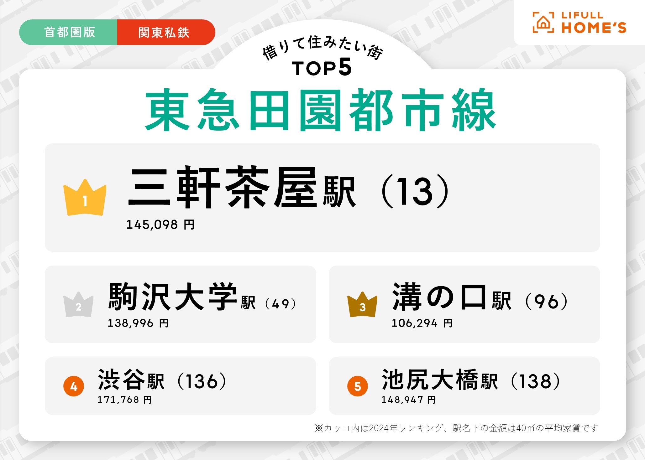 「住みたい街が多い鉄道路線ランキング・首都圏私鉄編」の4位は東急田園都市線です。東急田園都市線の住みたい街ランキングは、1位「三軒茶屋」(借りて住みたい街ランキング首都圏版13位)、2位「駒沢大学」(同49位)、3位「溝の口」(同96位)、4位「渋谷」(同136位)、5位「池尻大橋」(同138位)となりました。東急田園都市線はTOP200内に9駅がランクインし、東急田園都市線は「渋谷」から神奈川県大和市の「中央林間」までを結び、「渋谷」からは東京メトロ半蔵門線が接続し、都心を経由し「押上」まで繋がっています。TOP5のうち4駅は、都心の駅がランクインしました。「渋谷」から3駅圏内と近いため、いずれも平均家賃は13万円以上です。