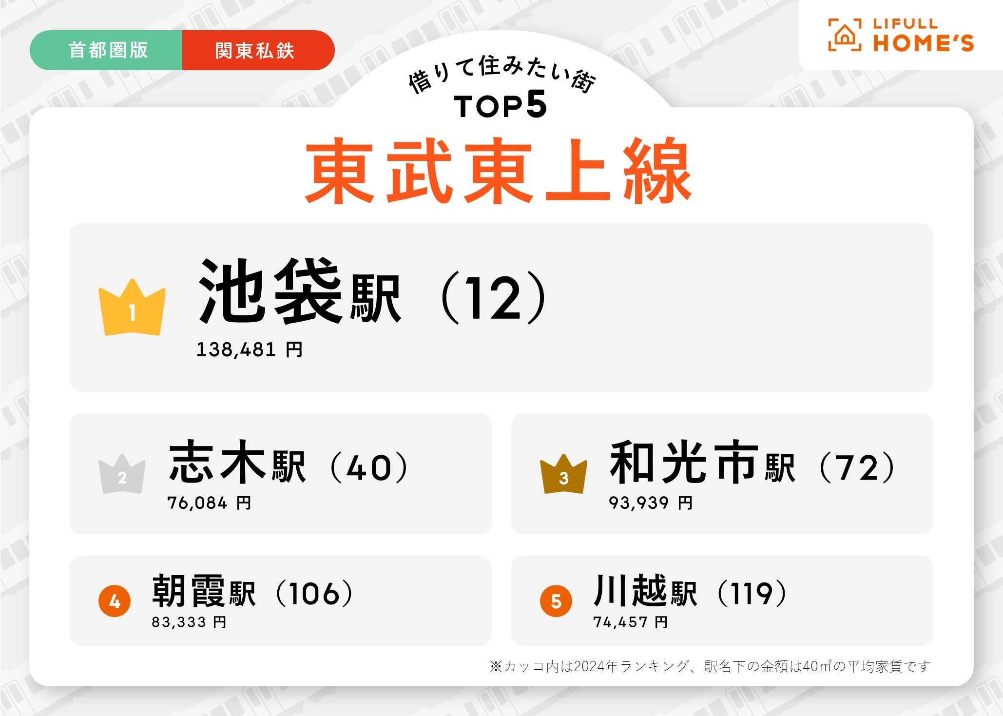 「住みたい街が多い鉄道路線ランキング首都圏・私鉄編」の3位は東武東上線です。東武東上線の住みたい街ランキングは、1位「池袋」(借りて住みたい街ランキング首都圏版12位)、2位「志木」(同40位)、3位「和光市」(同72位)、4位「朝霞」(同106位)、5位「川越」(同119位)となりました。東武東上線は、TOP200内に11駅がランクインし、東京都豊島区の「池袋」から埼玉県大里郡寄居町の「寄居」までを結び、埼玉県の西側のエリアから都心へ乗り換えなしでアクセスできます。