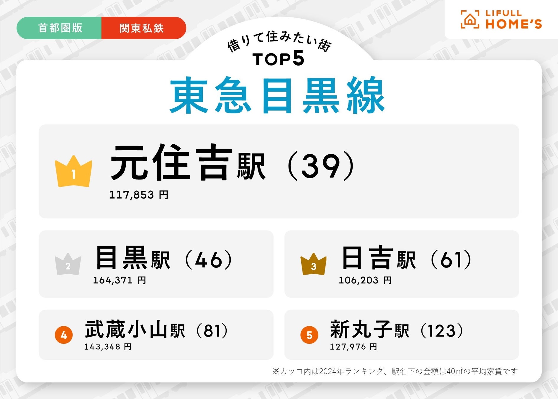 「住みたい街が多い鉄道路線ランキング・首都圏私鉄編」の5位は東急目黒線です。東急目黒線の住みたい街は、1位「元住吉」(借りて住みたい街ランキング首都圏版39位)、2位「目黒」(同46位)、3位「日吉」(同61位)、4位「武蔵小山」(同81位)、5位「新丸子」(同123位)となりました。東急目黒線は、TOP200内に8駅がランクインしています。東急目黒線は「目黒」から神奈川県横浜市港北区の「日吉」まで結んでいます。目黒駅はJR山手線、東京メトロ南北線、都営三田線も乗り入れているので、乗り換えすることなく渋谷や新宿、品川方面へ行くことができます。