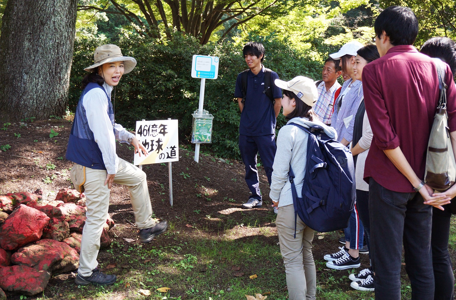 公園内のコースでは、「緑の教室」「裸足の道」「1mの地球」「46億年地球の道」の4つのプログラムを、約1時間半かけて体験していただきます。西武造園の専属インストラクターが、過去に起きた地球の壮大な物語と生物の進化についてドラマチックに解説することで、地球の環境問題について楽しく学ぶことができるプログラムとなっています。
