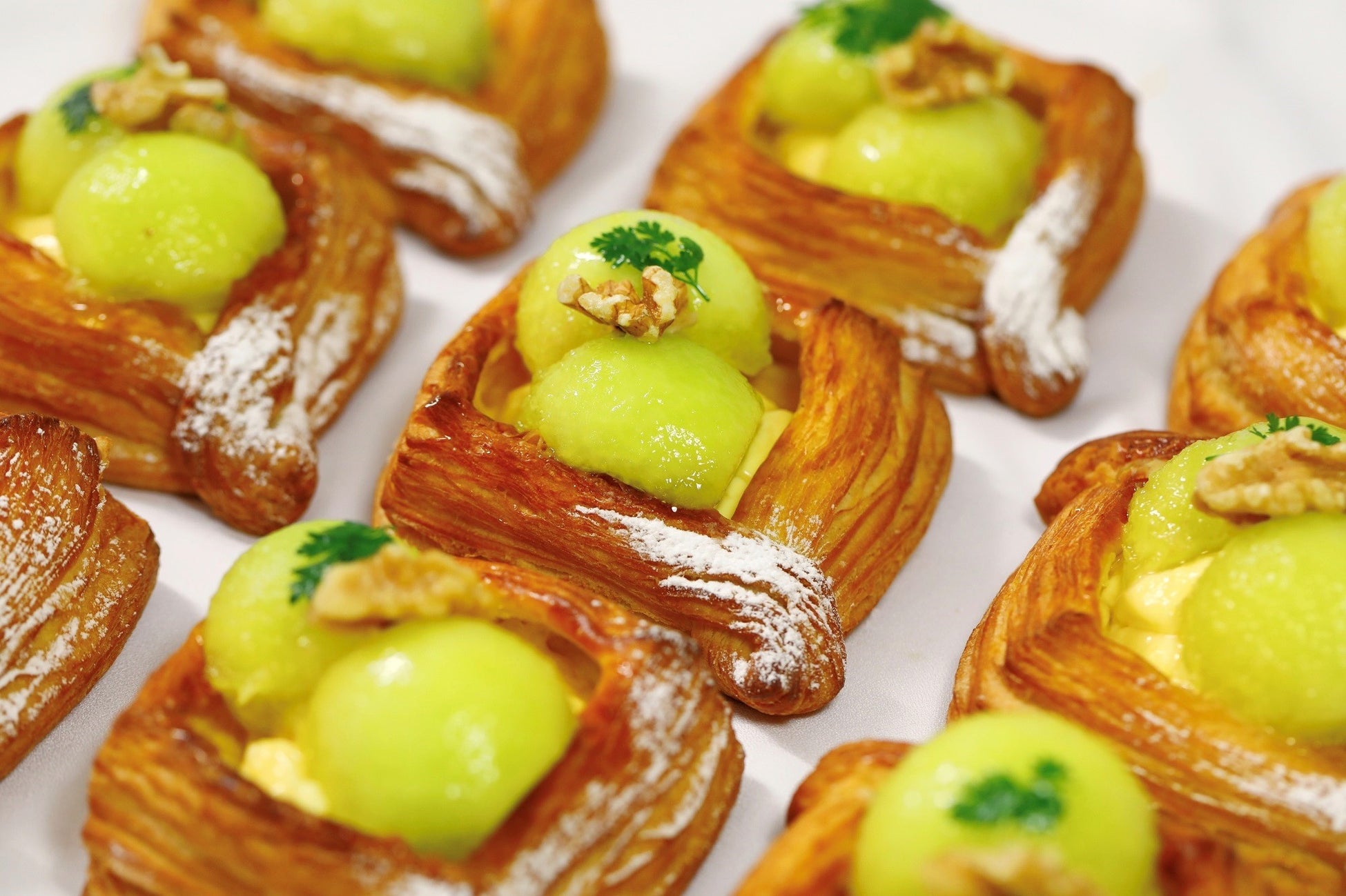 サクサクのデニッシュになめらかなカスタードやみずみずしいメロン、カリッと香ばしいクルミを乗せ、多様な食感が織りなす飽きのこない味わいに仕上げました。メロンのやさしい甘さと爽やかな香りが、暑さに疲れた体をきっと癒やしてくれるはず。