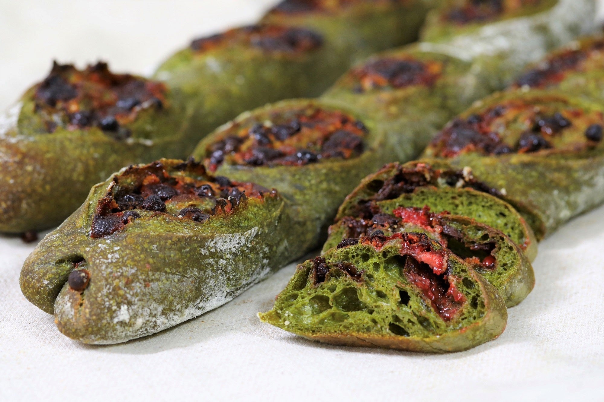 いちごチョコの甘酸っぱさや練乳のやさしい甘さが、抹茶のほのかな渋みを引き立たせ、甘さとほろ苦さの調和が絶妙なバゲットに仕上げました。抹茶の鮮緑に、いちごチョコの赤と、色鮮やかなビジュアルもお楽しみいただけます。