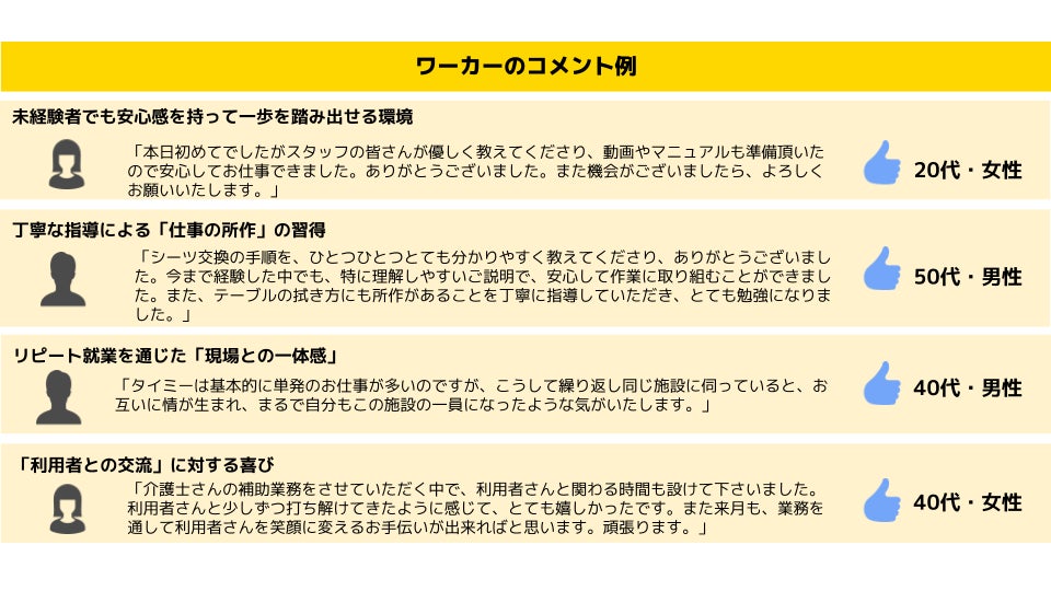 ワーカーの皆さんからは就業後、「動画やマニュアルの準備があって安心して働けた」「利用者との交流が嬉しかった」といったコメントもいただいています。無資格・未経験者が介護の仕事に無理無く従事できていることが窺えます。