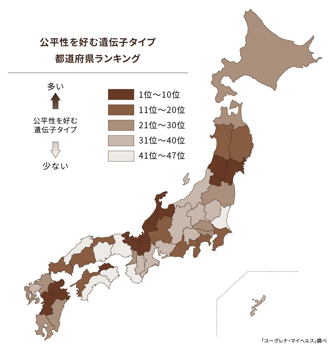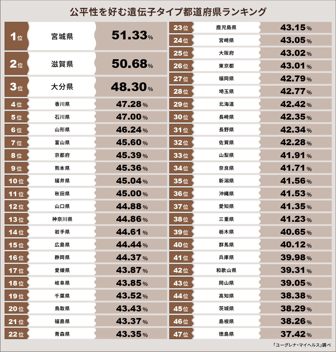 経済や政治に関して公平性を好む遺伝子タイプが多い都道府県ランキングを発表 1位 宮城県、2位 滋賀県、3位 大分県