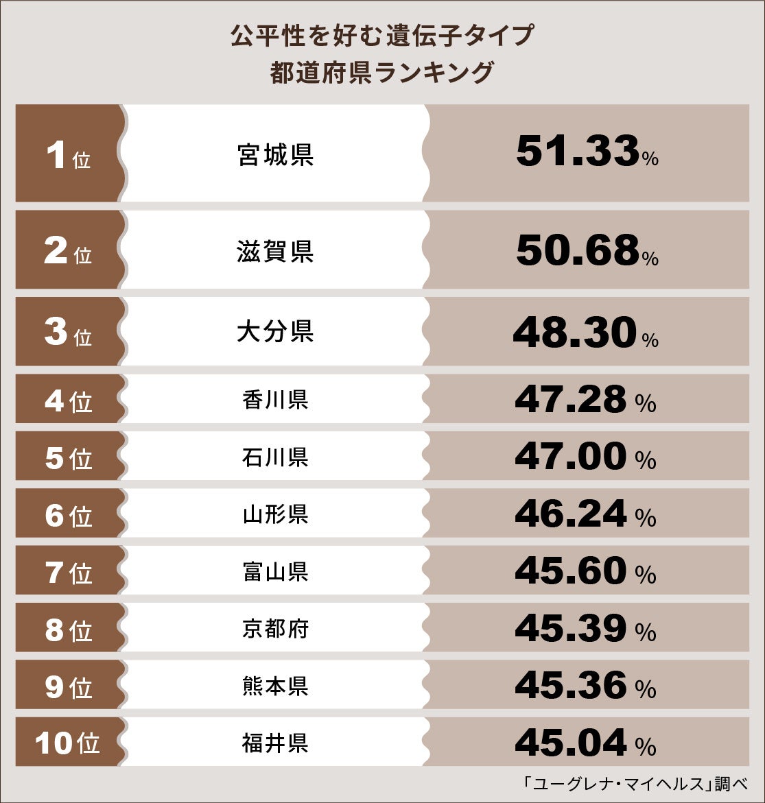 上記の解析結果より、公平性を好む遺伝子タイプの人の割合が相対的に高い都道府県は、1位 宮城県、2位 滋賀県、3位 大分県、4位 香川県、5位 石川県、6位 山形県、7位 富山県、8位 京都府、9位 熊本県、10位 福井県となりました。